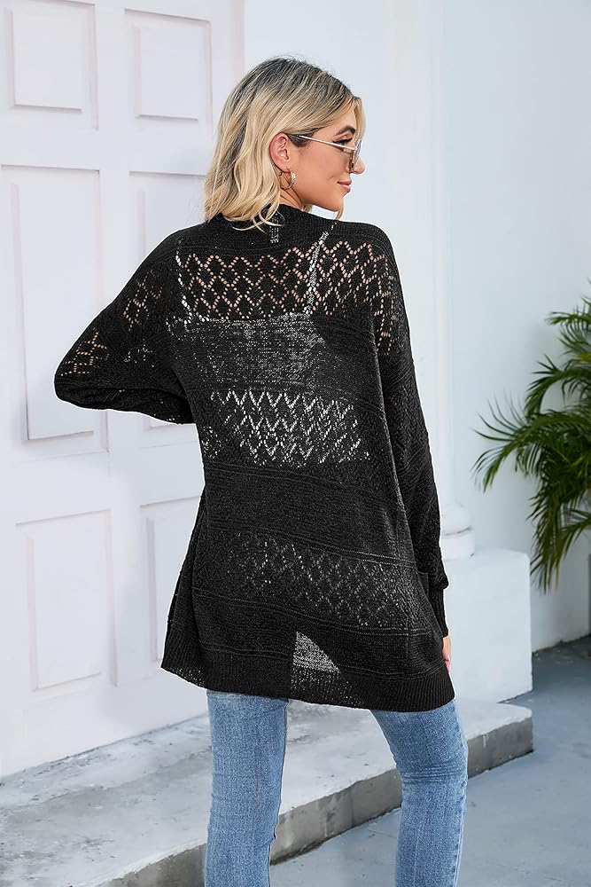 التصميم: سترة محبوكة، رقبة على شكل حرف V، كم طويل، رفيع شفاف من خلاله، سترات صوفية منسوجة مفتوحة من الأمام للنساء، طول فوق الركبة، فضفاض. التصميم المجوف الفريد للسترة يضفي مظهرًا جذابًا، مما يجعلها مناسبة لمجموعة متنوعة من المناسبات. يمكنك ارتداؤه كقميص مكيف للمناسبات الداخلية أو ارتدائه فوق ملابس السباحة المفضلة لديك كغطاء للشاطئ.