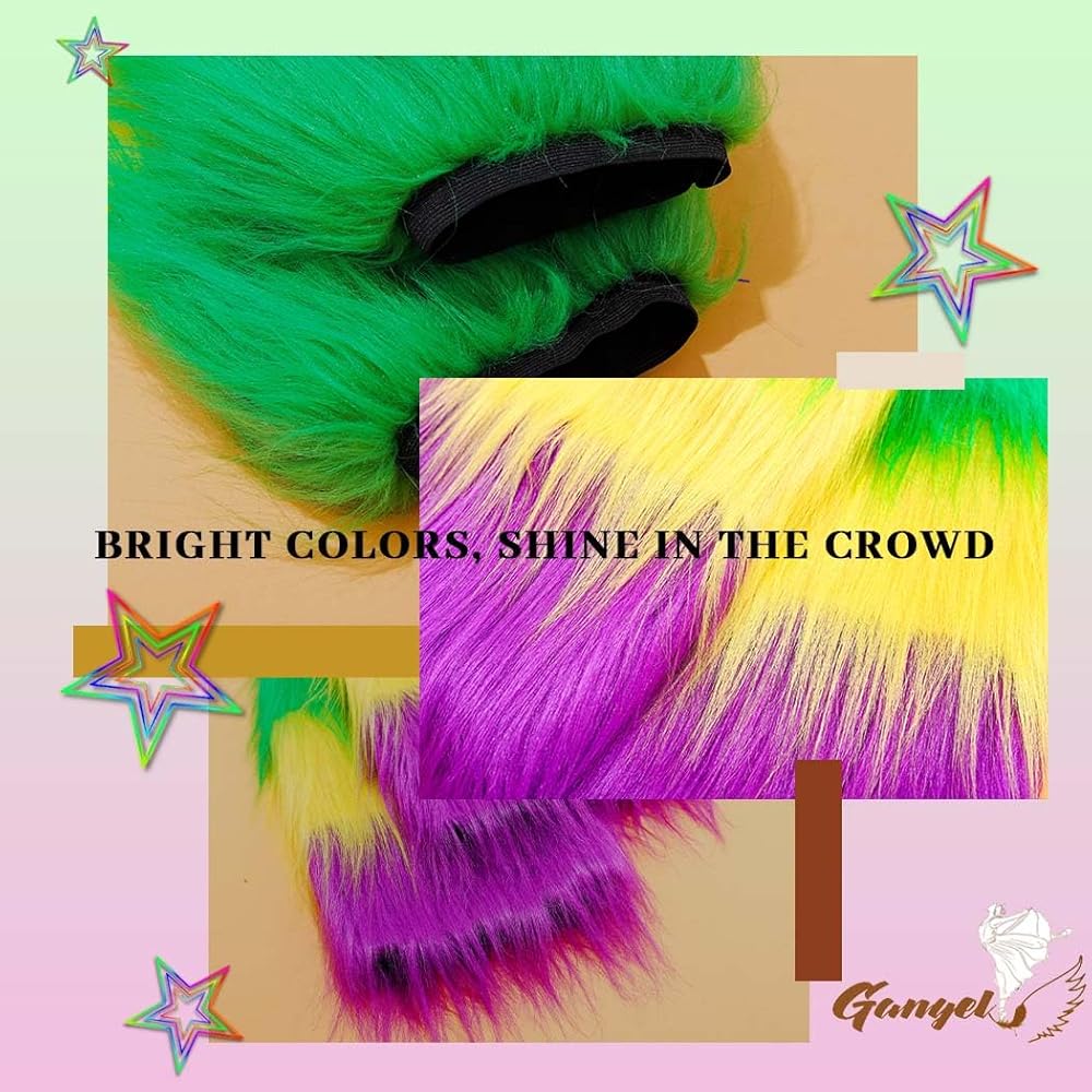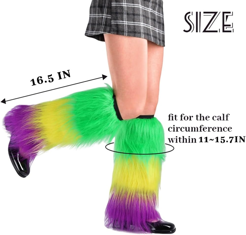 Mardi Gras leg warmer are made of nonwovens and chemical fibers,elastic cords to fit the legs, and fur socks that don't fall off easily, and are lightweight and warm.
