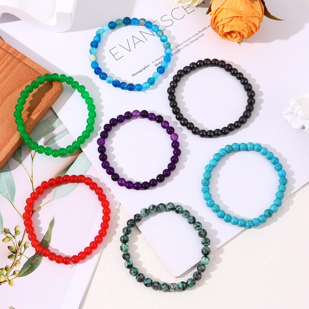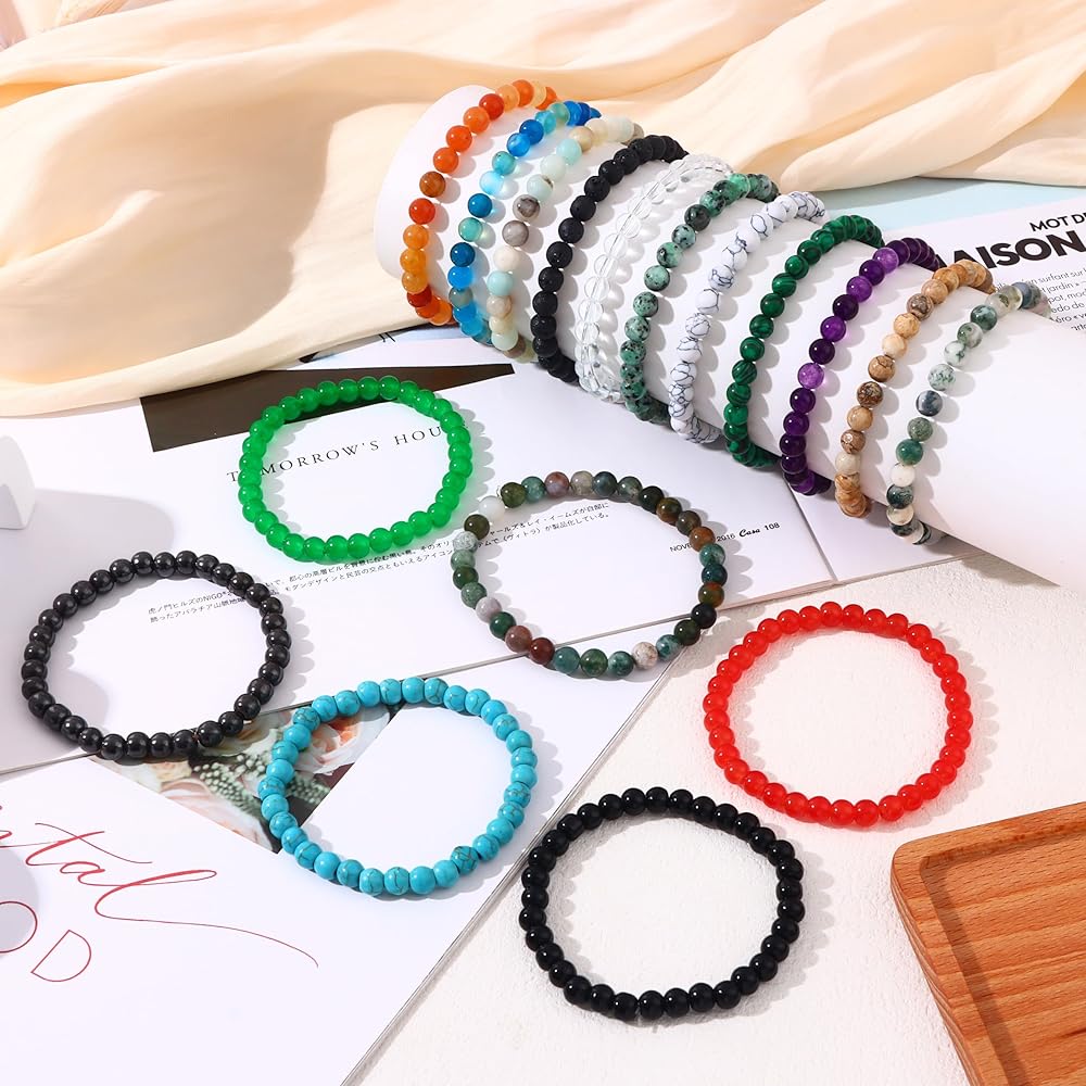 • أساور من الأحجار الكريمة شبه الثمينة: ​​تحتوي العبوة على 17 قطعة من أساور الخرز الحجري الطبيعي بألوان مختلفة، بما في ذلك الفيروز والجمشت والعقيق الأحمر وعين القط والعقيق الهندي والأمازونيت وغيرها. الأساور الكريستالية الملونة القابلة للتمدد يمكن أن تتطابق بسهولة مع ملابسك اليومية.