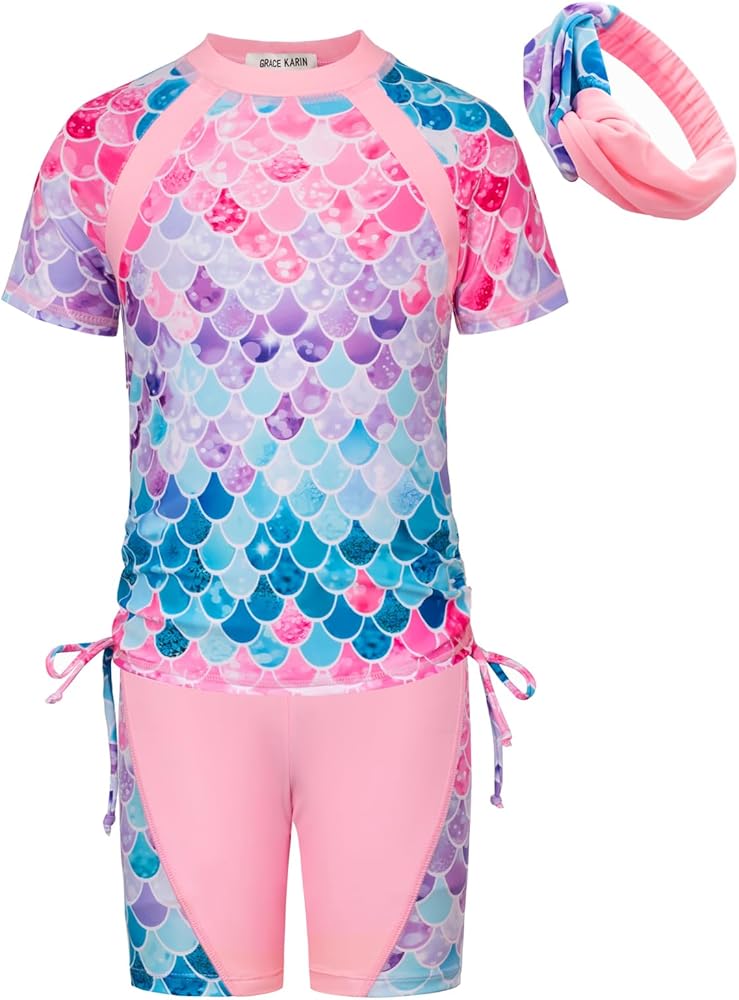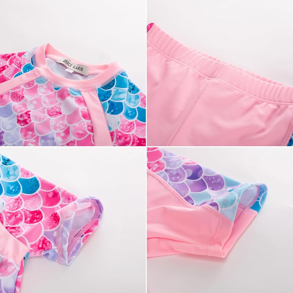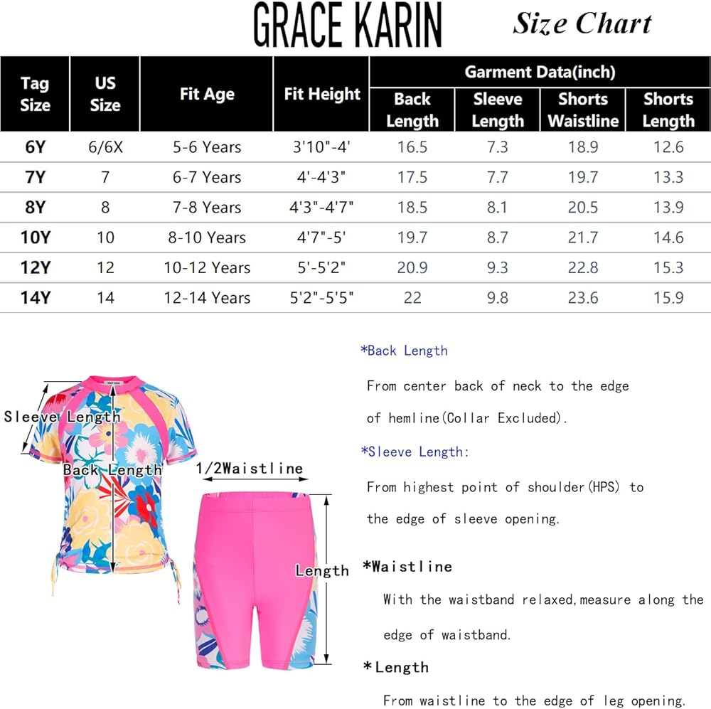 【تصميم مريح】تتكون ملابس السباحة الواقية من الطفح الجلدي للفتيات من GRACE KARIN من قميص قصير الأكمام، وشورت سباحة بخصر مرن، وعصابة رأس مطابقة. انها مناسبة للفتيات الذين تتراوح أعمارهم بين 6-12 سنة. يوفر التصميم المكون من قطعتين تغطية كاملة وراحة بالإضافة إلى مرونة أكبر أثناء نمو طفلتك الصغيرة. الشورت مبطن جزئيًا من الأمام لتوفير حماية أمنية جيدة.