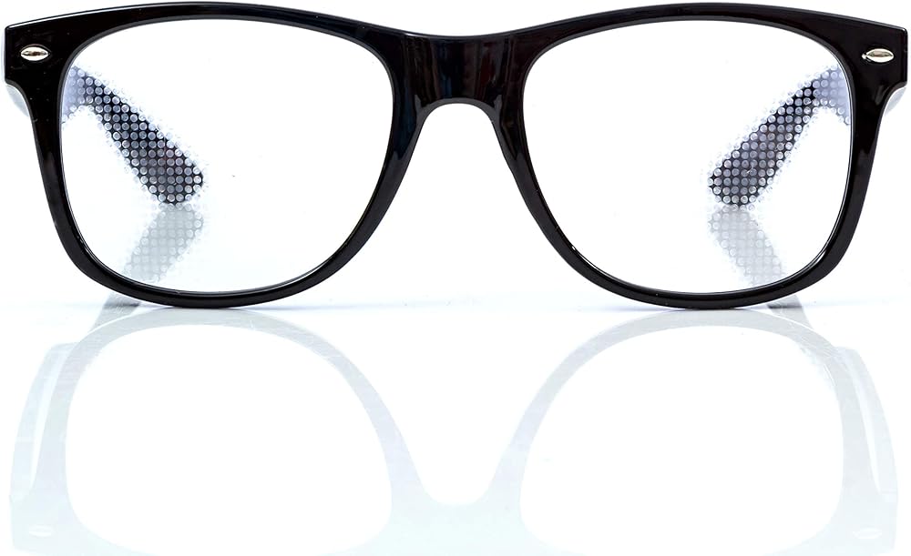 Heart Diffraction Glasses: These are our most popular diffraction glasses. The frames are black, sturdy plastic. Lenses are made from a clear plastic. Wear these and each point of light (not broad lights) will turn into a heart! Great for raves, music festivals, ridin' shotgun, Christmas light viewing, fireworks, and more! Will come in a microfiber pouch.