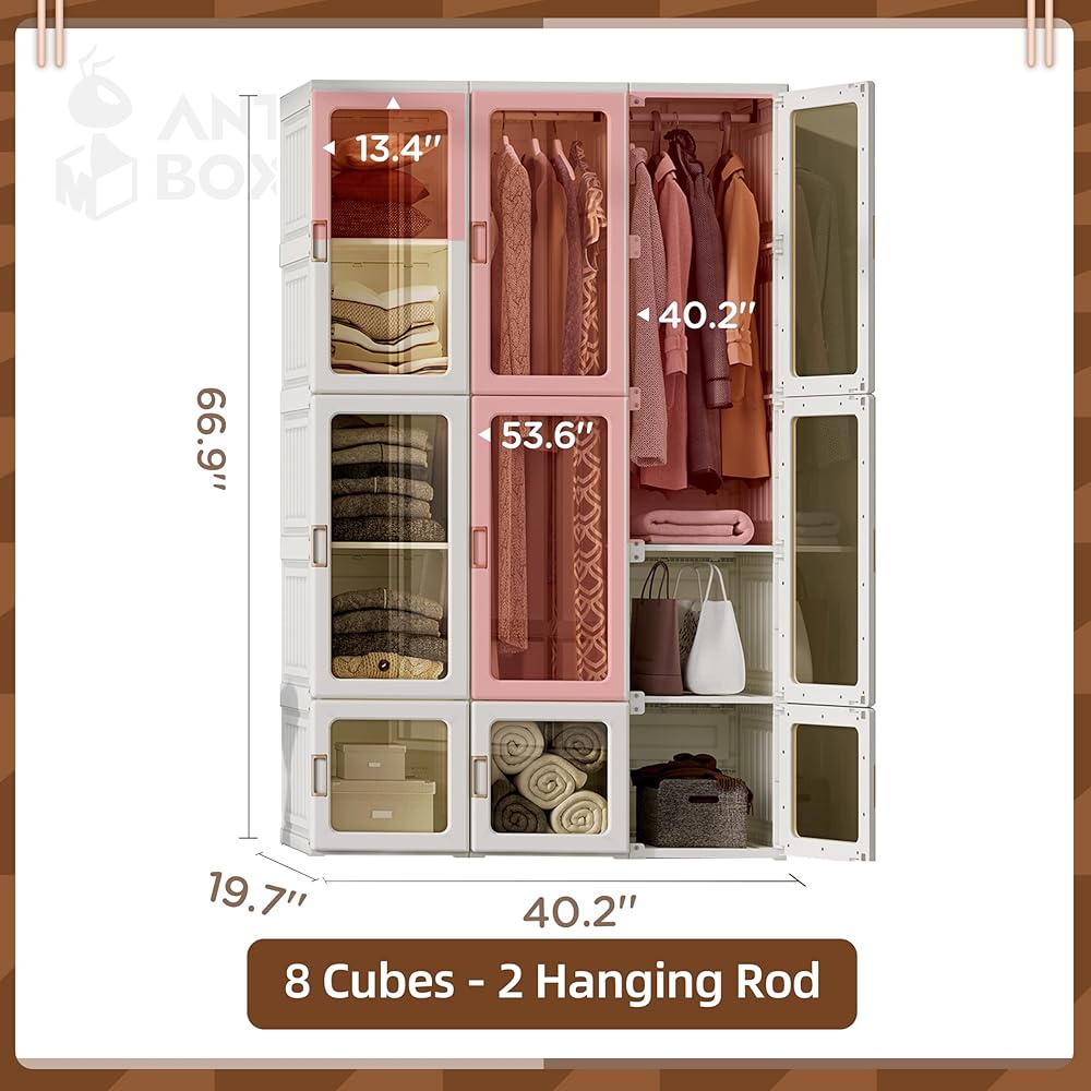ANTBOX منظم تخزين خزانة الملابس المحمول، مناسب لغرفة المعيشة وغرفة النوم وخزانة الملابس البلاستيكية مع باب شفاف مغناطيسي وسهل التجميع 8 مكعبات و2 قضيب تعليق
