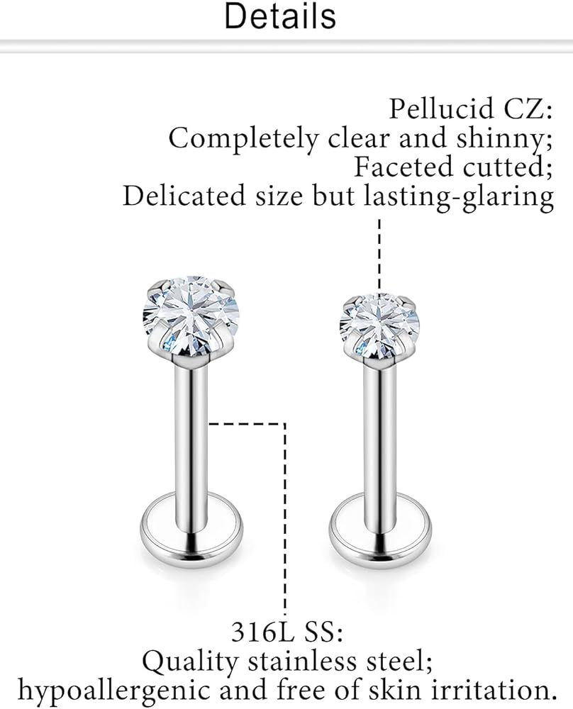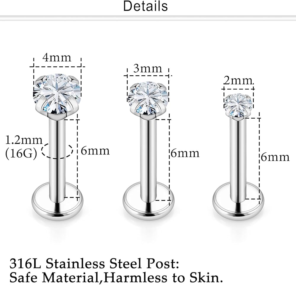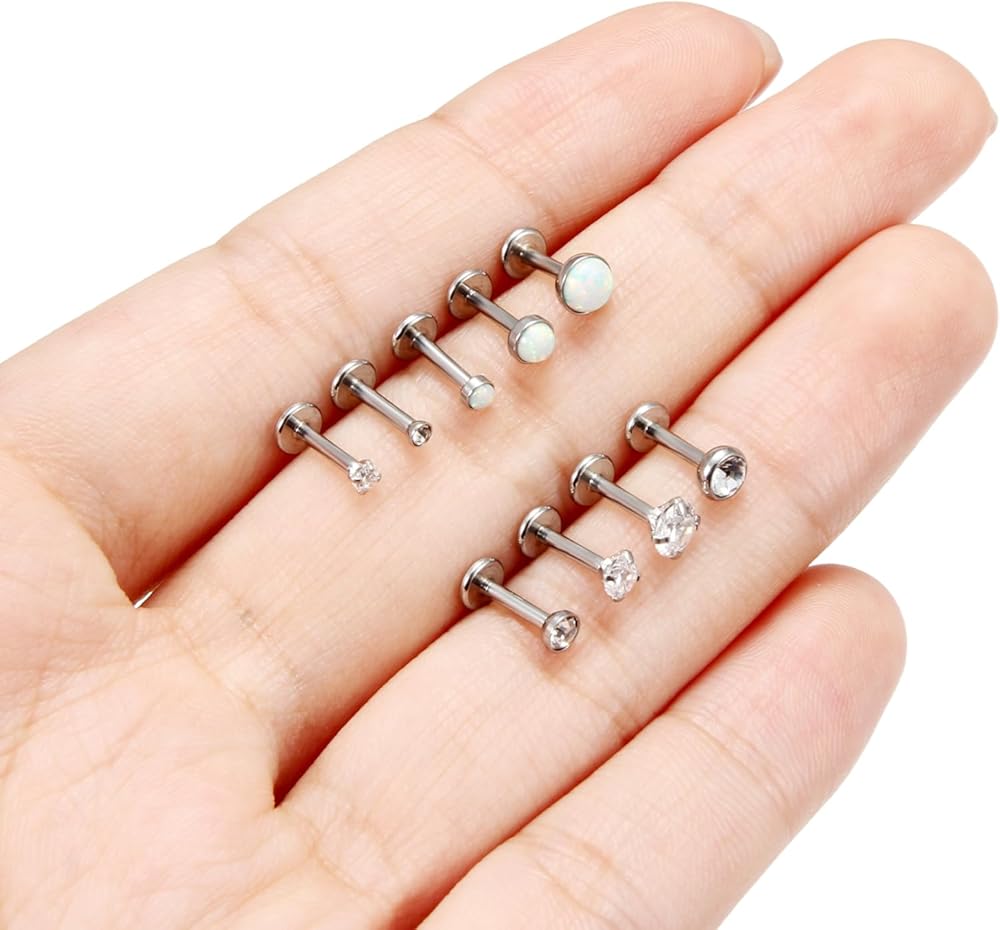 • UNIQUE SET--One Order Includes 9 Pieces of Internally Threaded Labret Studs in 3 Styles(Opal,Prong Round CZ,Round CZ). It Comes in Different Sizes So You Can Choose the Size That Best Fits You. Convenience and Ease of Internally Threaded Jewelry Makes It Compatible with Virtually Every Piercing Type.