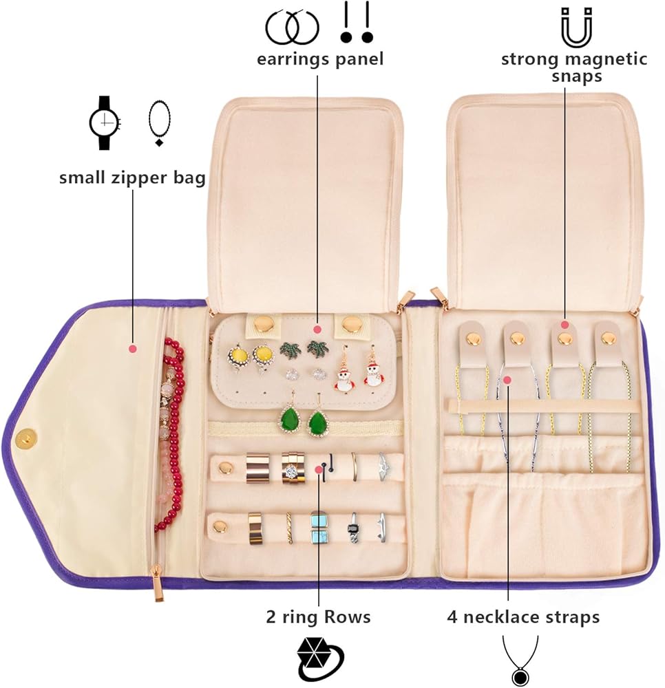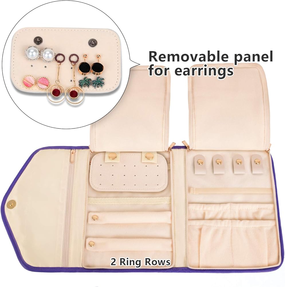 HIGH CAPACITY: 2 rows with snap to store your rings, A detachable earrings panel for 9 pairs earrings or eardrop, 1 small zipper pockets for your precious items, like bracelets, necklaces, watch, pendant, brooches and more, 4 necklace straps with snap.