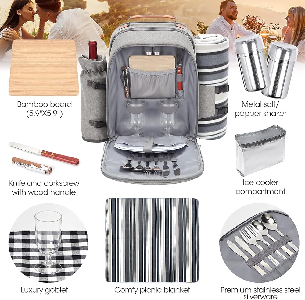 • 🎠مثالي للترابط: قضاء الوقت معًا كزوجين لا يقدر بثمن. مع حقيبة ظهر النزهة الفسيحة والمريحة، يوجد كل ما تحتاجه وأكثر للاستمتاع بإجازة رومانسية لساعات - بدءًا من أدوات المائدة الآمنة للغسل في غسالة الأطباق وحتى أدوات الطعام المتينة في الهواء الطلق، ولوح تقطيع من الخيزران، وبطانية نزهة، وحتى مبرد النبيذ.
