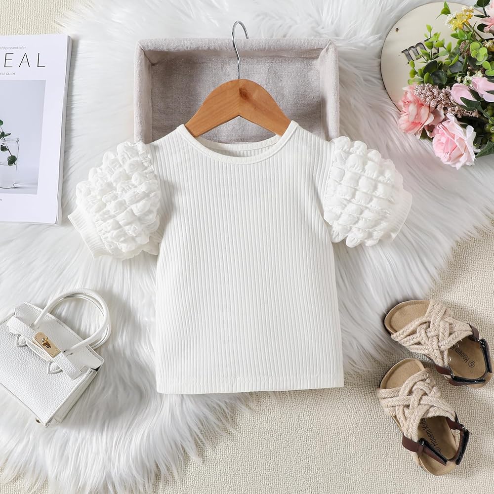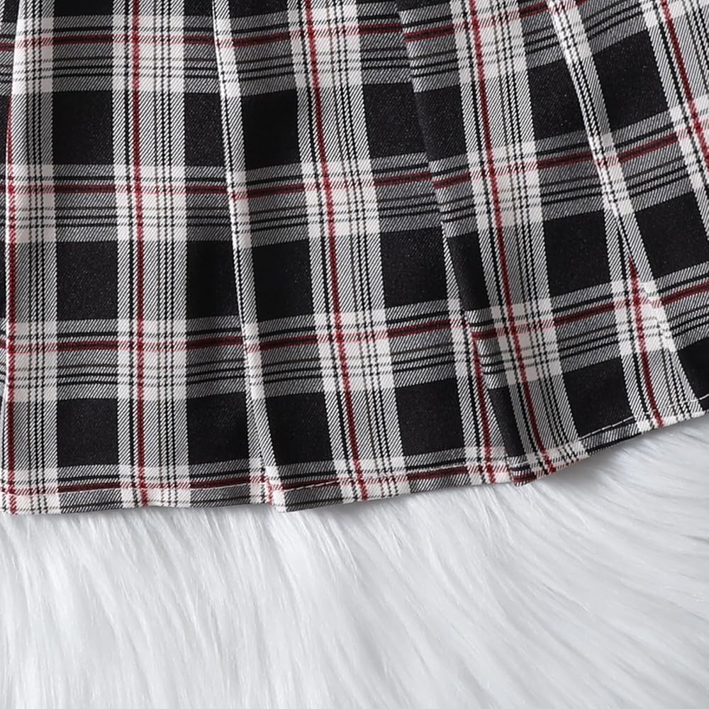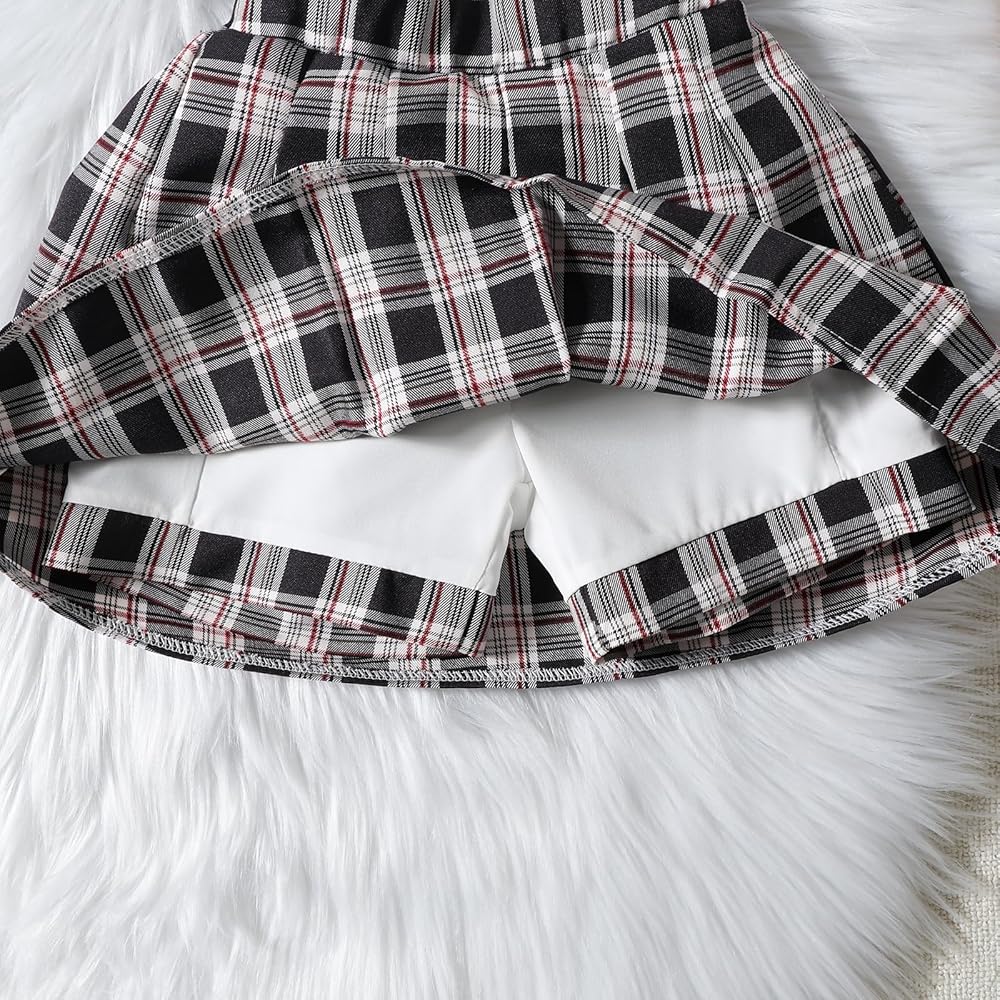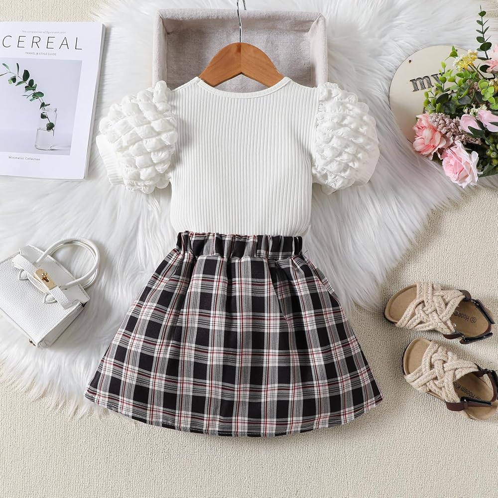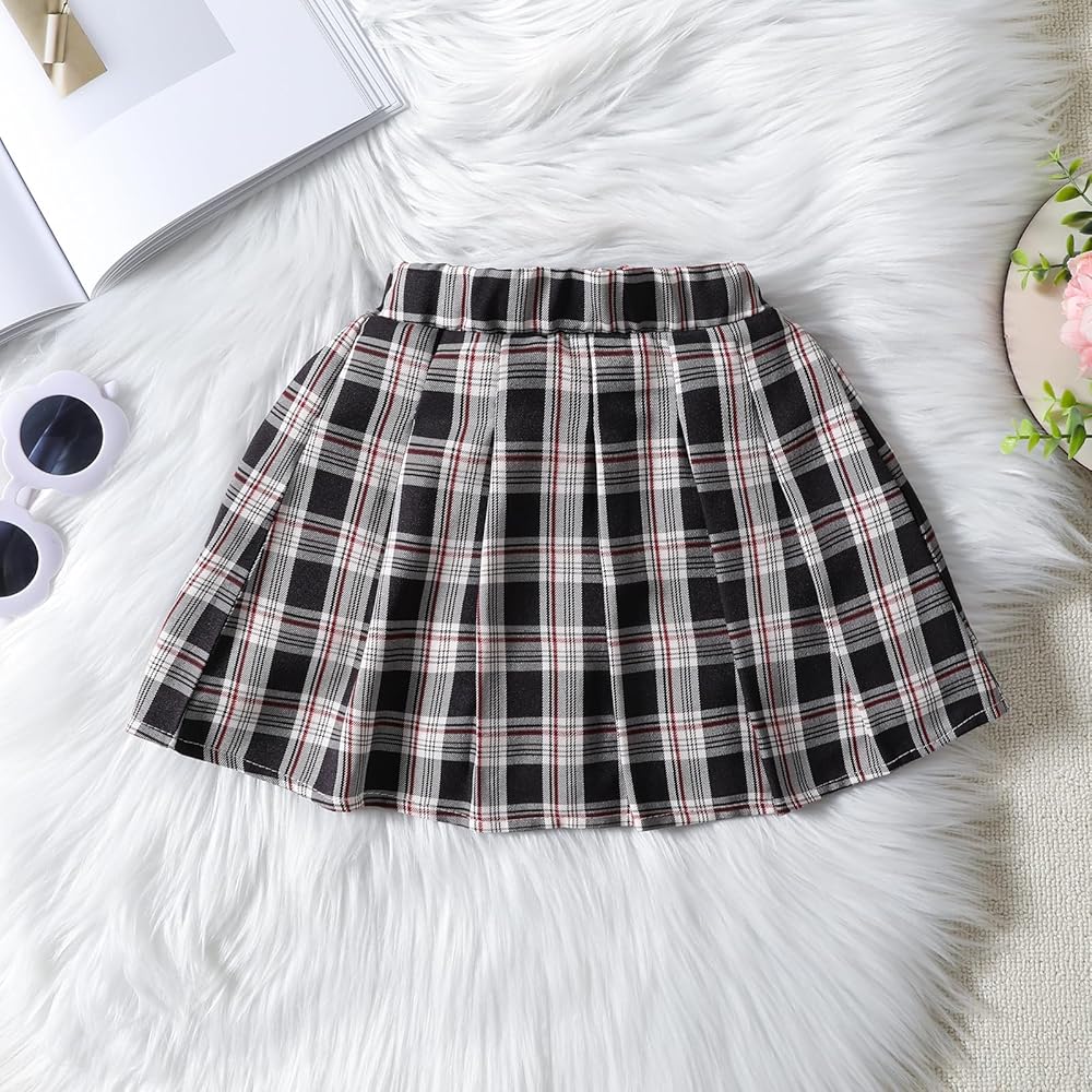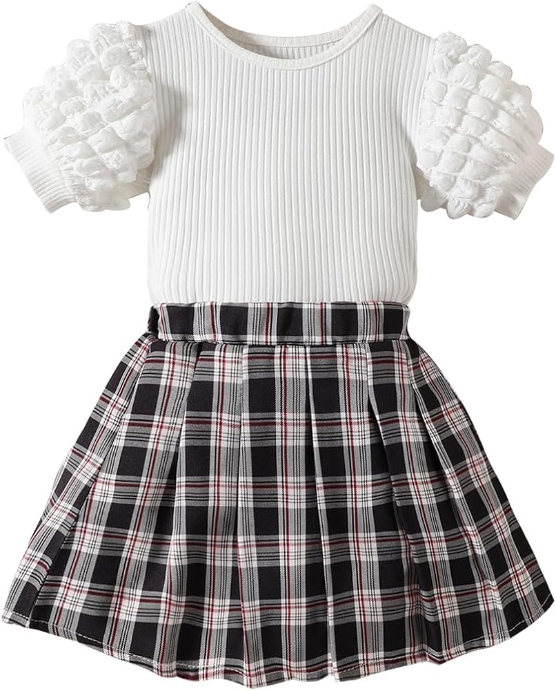 تصميم رقيق - ملابس الفتيات الصغيرات تأتي مع بلوزة علوية مضلعة بلون ثابت، مصممة بأكمام قصيرة منتفخة لطيفة، تنورة قصيرة بخصر مرن منقوشة مع شورت، تنورة على شكل تنورة مع شورت أمان مرفق، لا تقلق بشأن الحركة. الفتيات الصغيرات يمكن مطابقة ملابس التنورة مع السراويل الضيقة والمعطف والأحذية الطويلة والصندل والقبعة والحقيبة. ملابس الفتيات الصغيرة تخلق مجموعة متنوعة من الأشكال الرائعة والأناقة الجميلة لأميرتك.