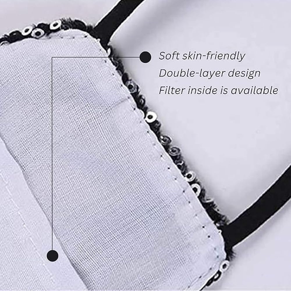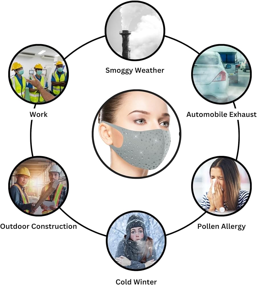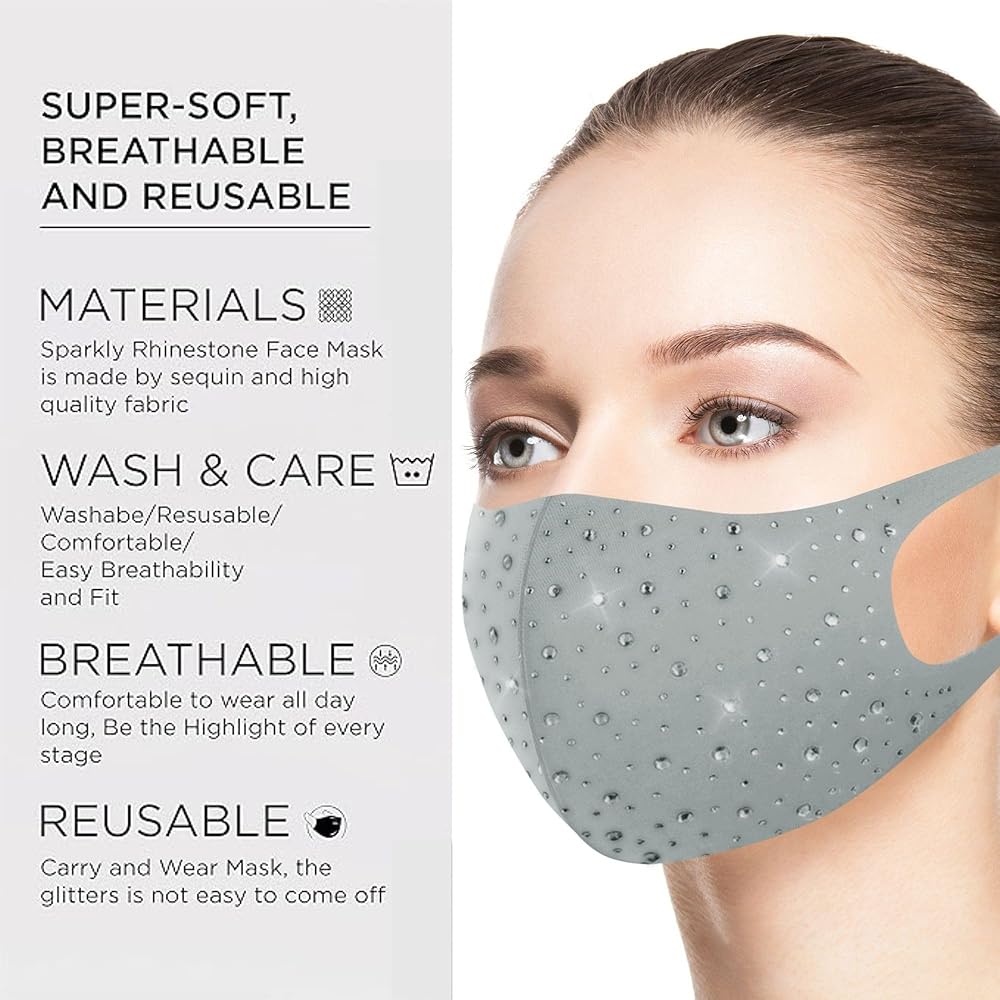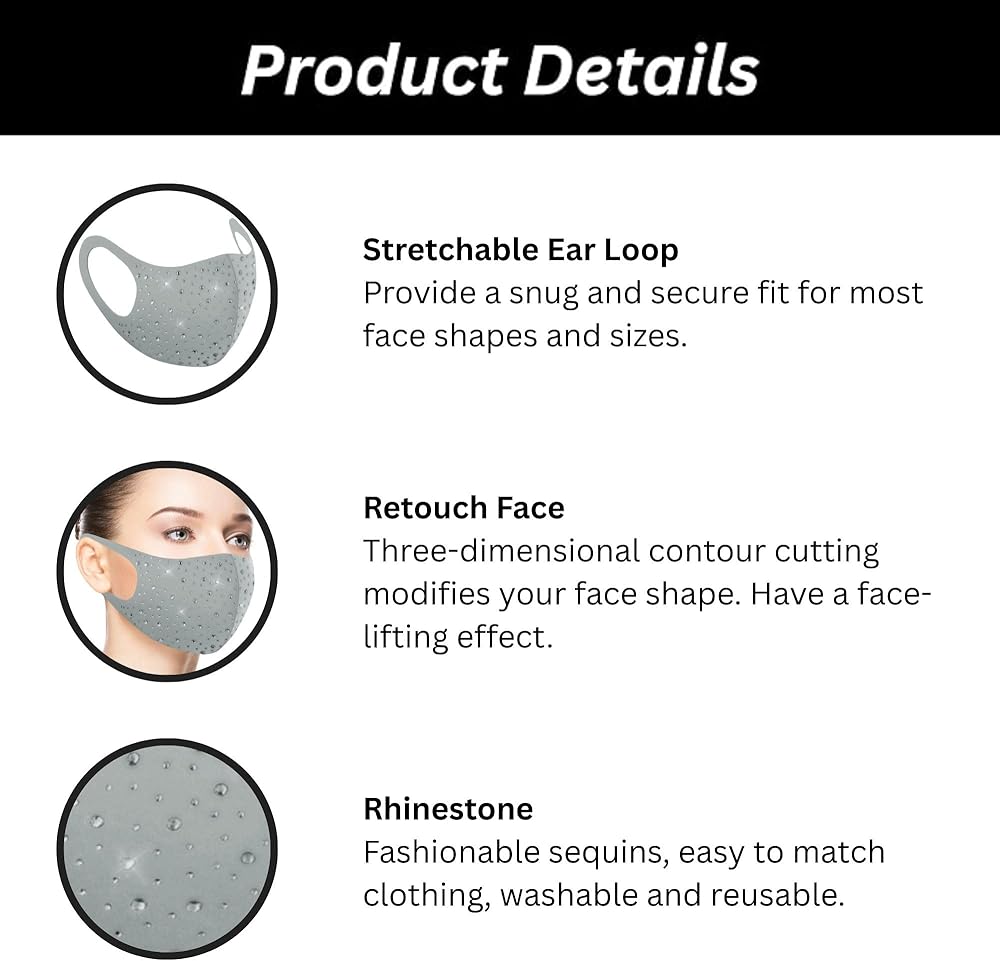 【قابلة لإعادة الاستخدام وقابلة للتعديل】 تصميم أحزمة الأذن قابلة للتعديل، مقاس واحد يناسب معظم أشكال الوجه. قناع الوجه المصنوع من أحجار الراين الخاص بنا قابل للغسل وإعادة الاستخدام. نقترح غسل القناع باليد وغسله مرتين في الأسبوع للحصول على أفضل النتائج.