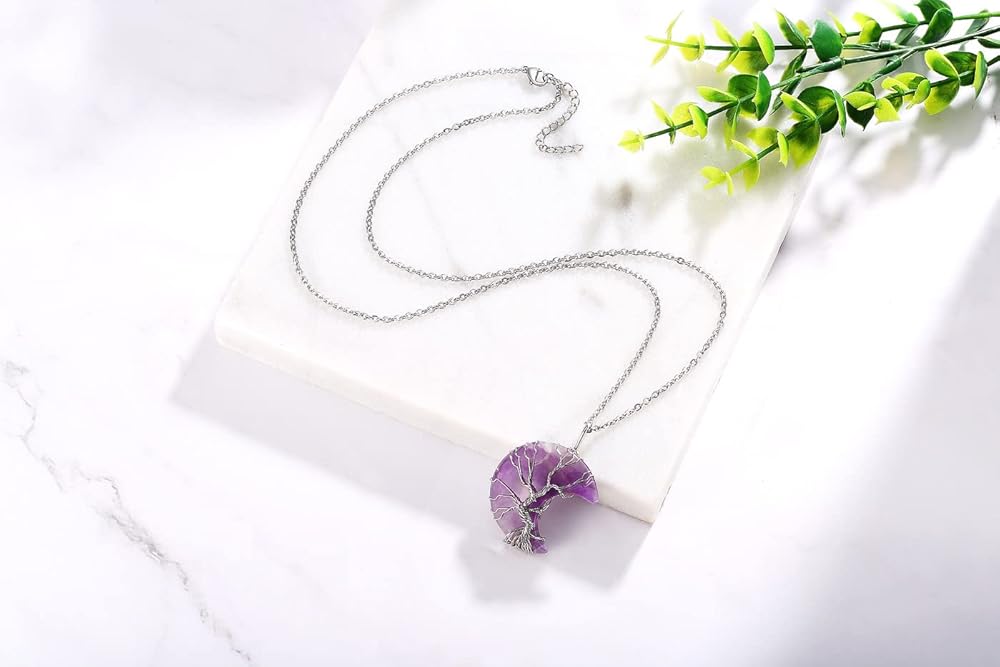 Crescent Moon Healing Crystal Necklace, dainty tree of life wrapped pendant, the healing quartz jewelry suits for mom, girlfriend, wife; a good gift choice for birthday, Christmas, Mother's Day, Valentine's Day, anniversary and etc.