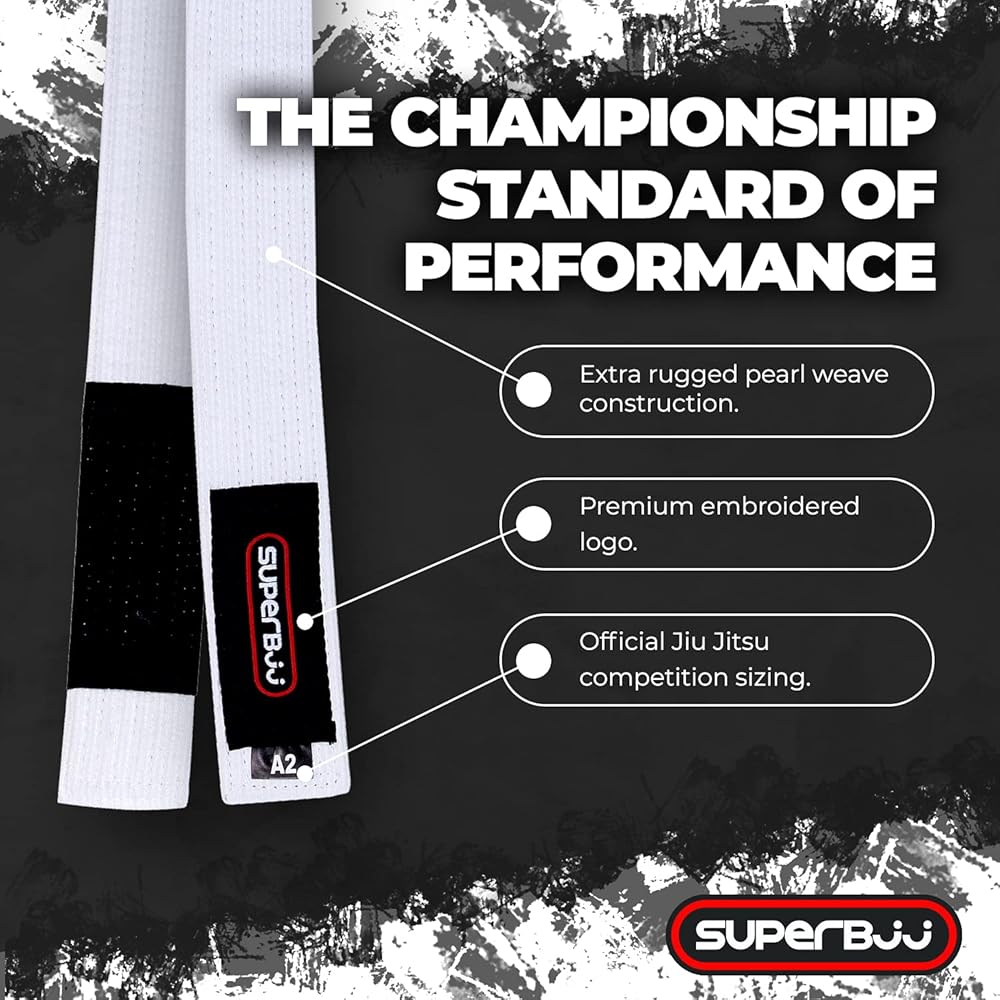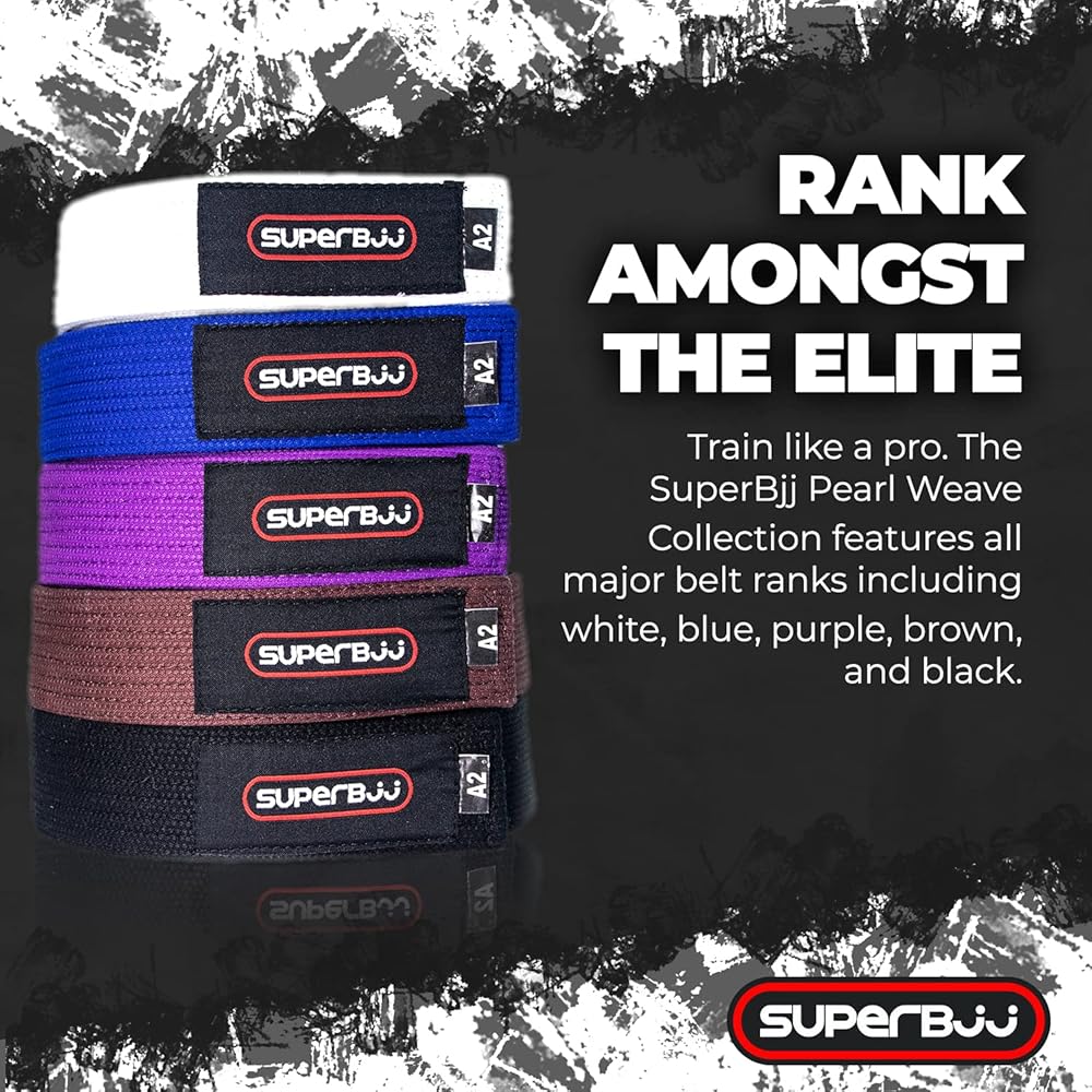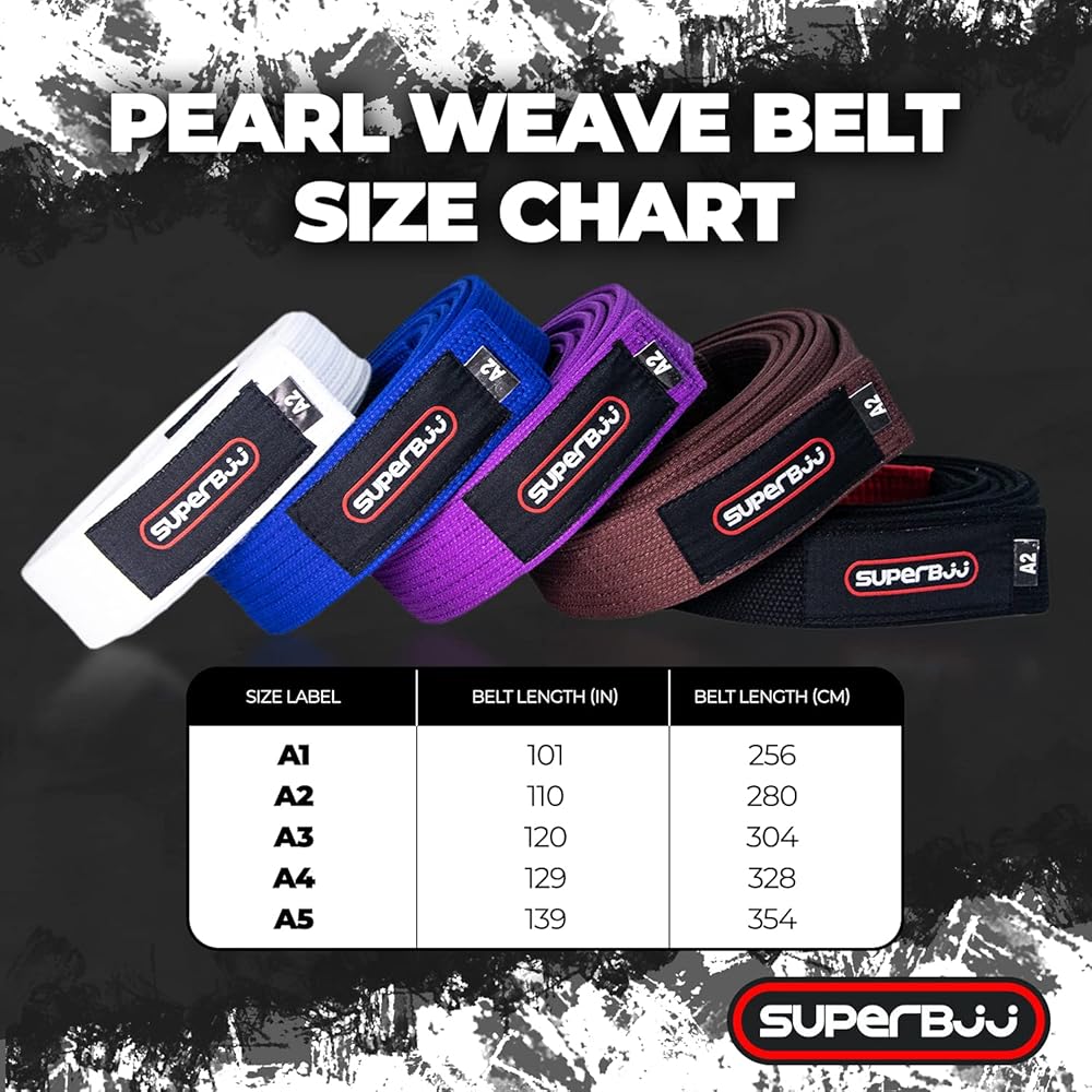 Once you try the SUPERBJJ Pearl Weave Premium BJJ Belt you'll notice the difference and never go back to regular BJJ belts. SUPERBJJ Pearl Weave Premium BJJ Belts offer premium quality and are made of 100% pearl weave fabric material the same as most standard gis. They come in sizes A1-A5 and all rank colors including white, blue, purple, brown and black. We recommend purchasing the belt size that matches your gi.