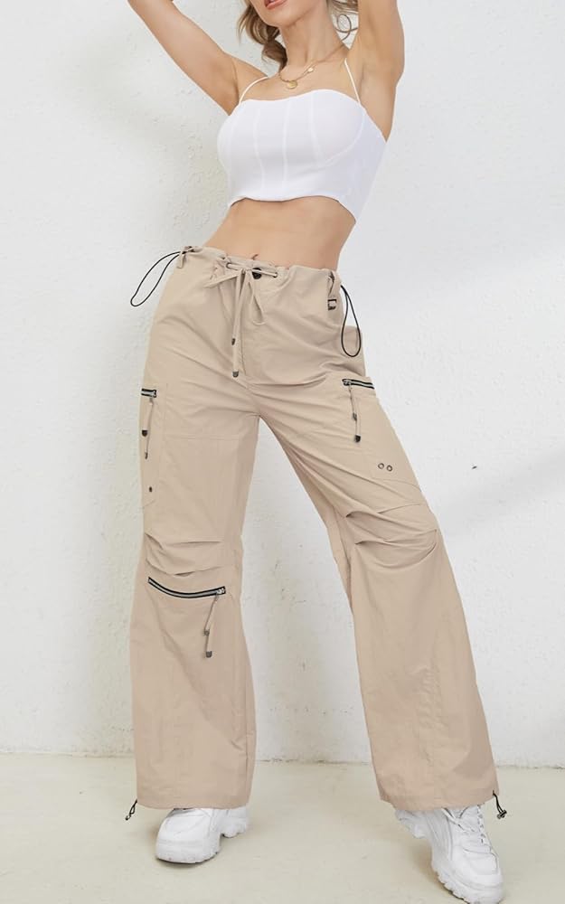 ملاءمة مريحة - بنطال باراشوت بخصر عالٍ مرن قابل للتعديل. أزرار مرنة قابلة للتعديل على جانبي الخصر لتناسب أشكال الجسم المختلفة. توفر السراويل الفضفاضة أقصى قدر من الراحة وحرية الحركة طوال اليوم.