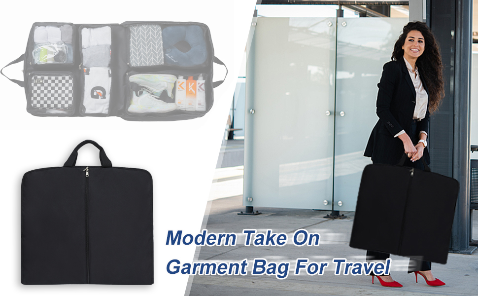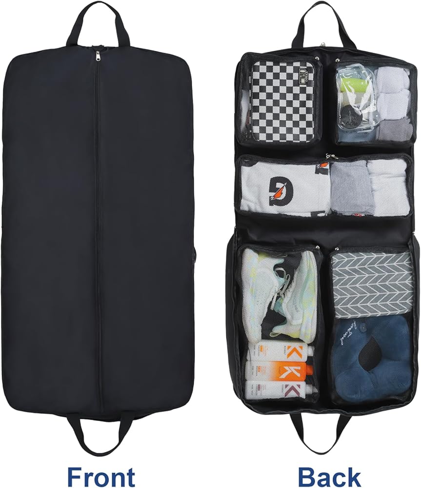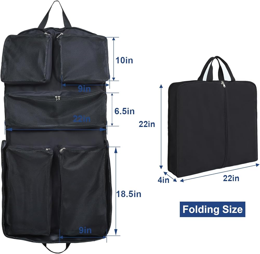 2 IN 1 Garment Travel Organizer: Weighing 2.5 pounds and measuring 22 x 22 x 4 inches when closed, this garment bag is generally carry-on compliant Since it combines the folding garment bag and multiple packing cubes into a single product, provides enough storage to hold multiple days' worth of clothes