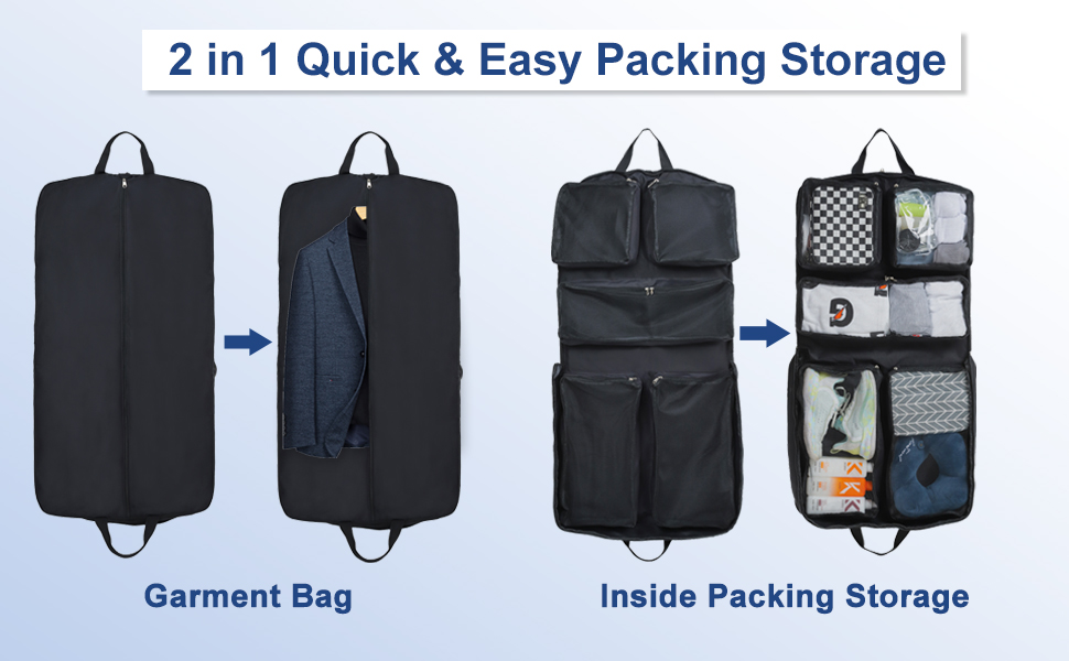 Quick & Easy Packing Storage: The Travel Garment Bag has Five Mesh Zipper Pockets on the inside for travel storage. 2 small pockets for storing socks, jewelry, and toiletries; 1 long pocket for storing undergarments, belts, tiles, and small items, 2 large storage space for jackets, sweaters or other garments and shoes, well organize your clothing on the go and make traveling for work easier