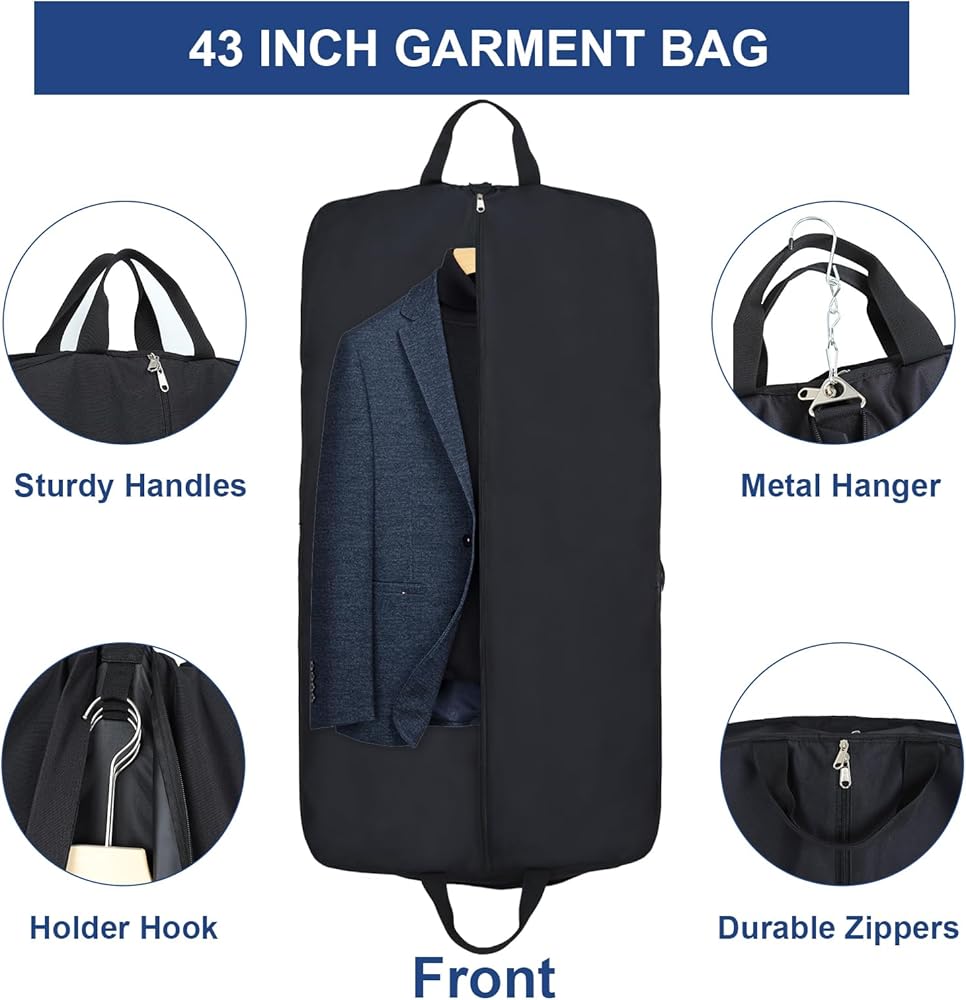 Keep Clothing Protected: Measures 43" x 22", this garment bag for hanging clothes is specially designed with 3 interl loop holders to hang and keep suits tidy and free from wrinkles. It can store, carry, and organize 1-3 suits, shirts, and short dresses. Ideal for business trips or weekend vacation that helps keep clothes looking fresh and wrinkle-free upon arrival