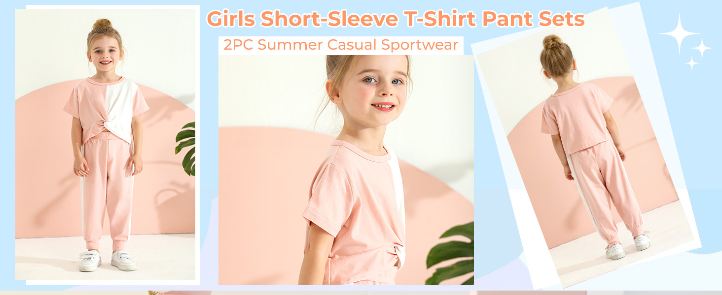 التعبئة: سويت شيرت بناتي بأكمام قصيرة + بنطلون رياضي ملابس صيفية. الألوان الزاهية مثالية للصيف.