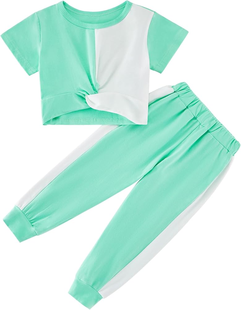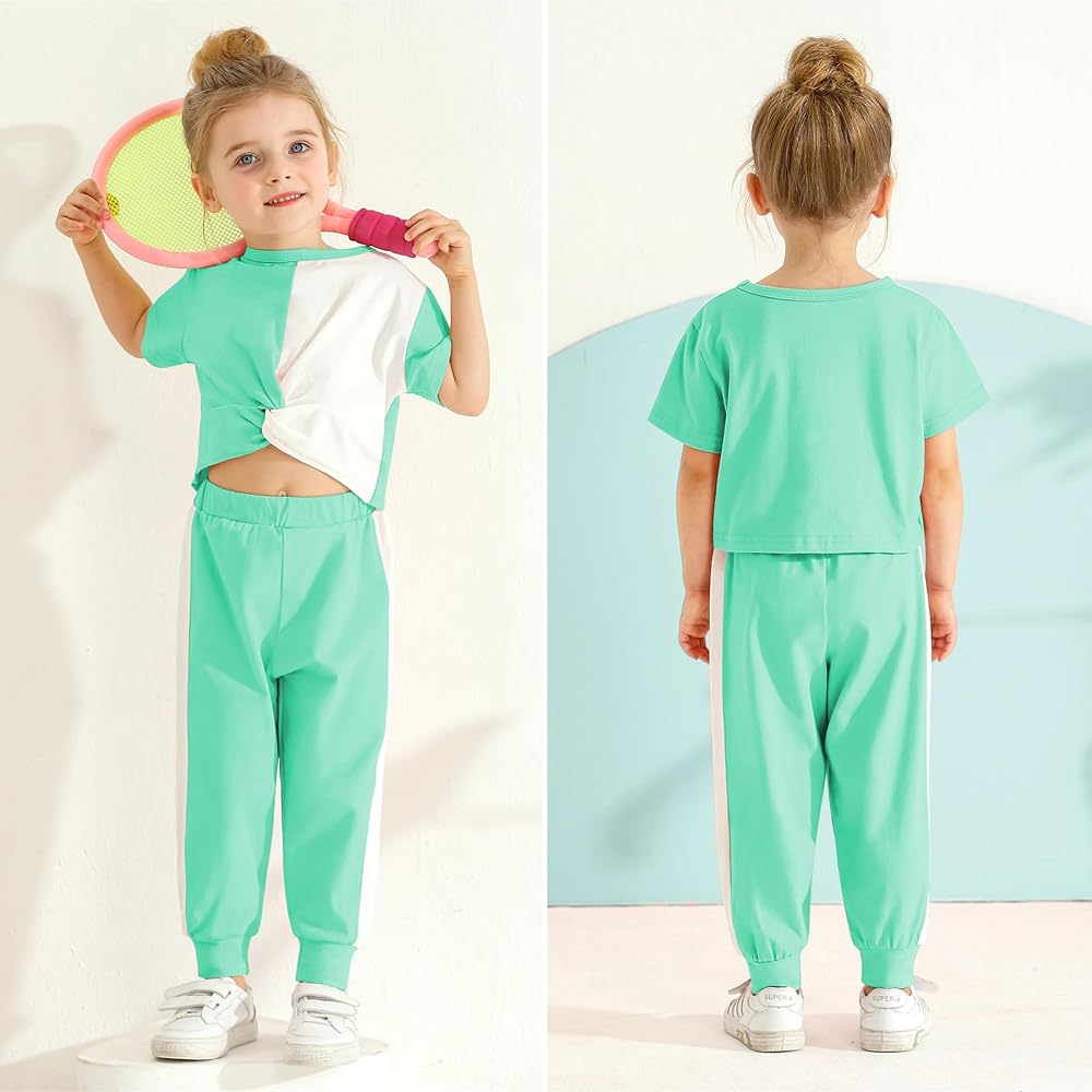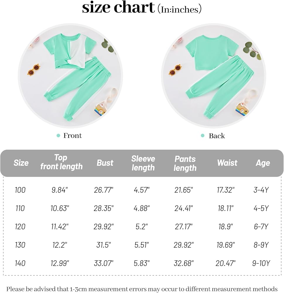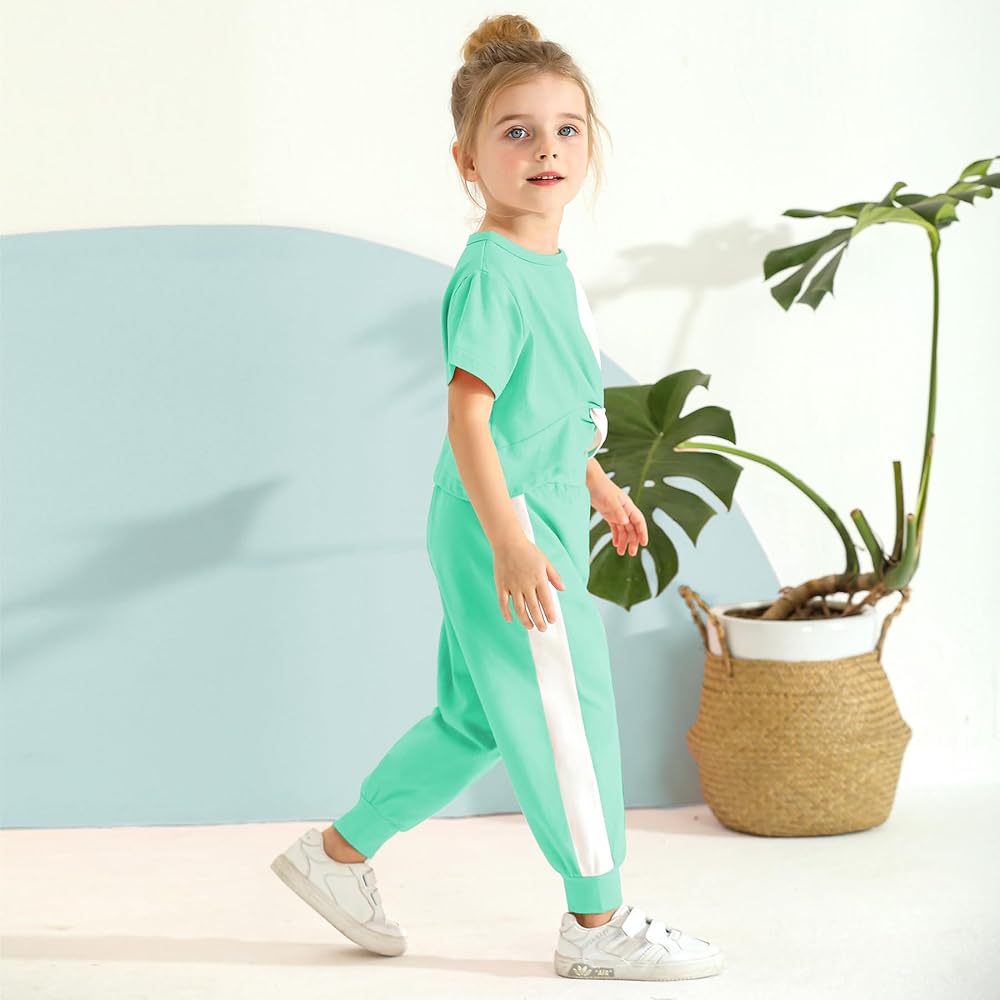 الفتيات مع: قميص من النوع الثقيل بأكمام قصيرة ورقبة دائرية للفتيات، وبنطلون خصر مرن، أكثر ملاءمة. هذه المجموعة المكونة من قطعتين مناسبة للأطفال الصغار والكبار من عمر 3-4,4,4-5,6-7,8-9,9-10.