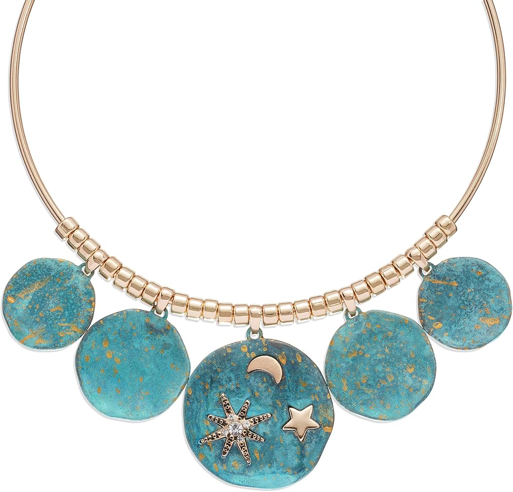 Robert Lee Morris Soho sleek round wire necklace featuring signature green patina organic discs at front adorned with mixed celestial motifs at center disc. Necklace has an adjustable lobster clasp closure. Made from polished gold-tone metal, green patina metal and glass.