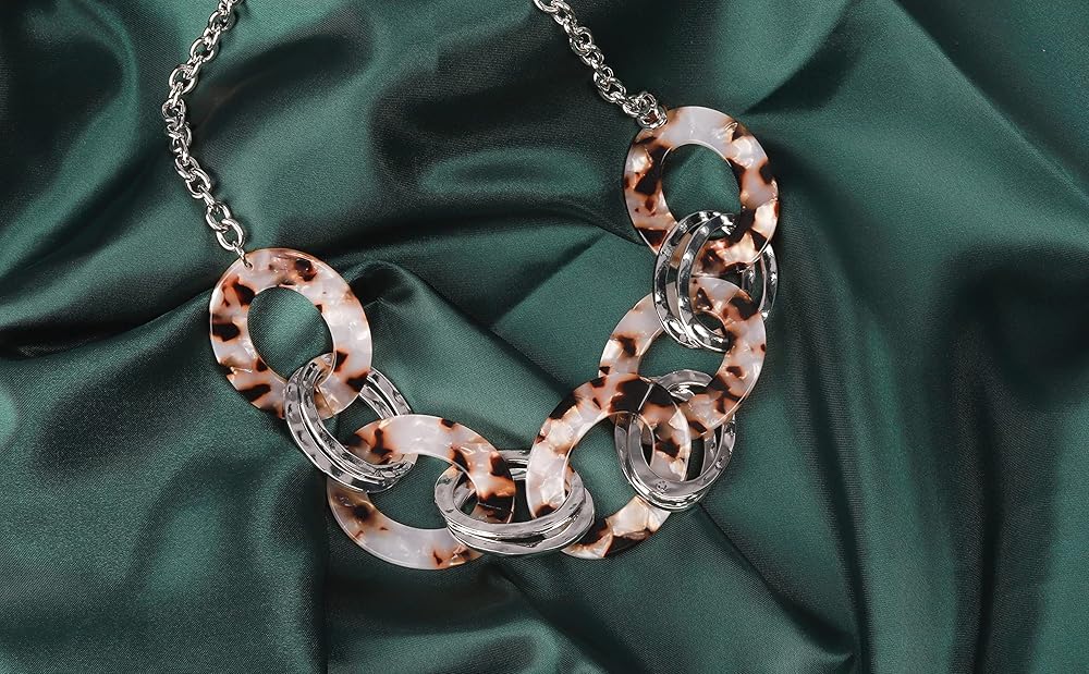 this exquisite acrylic tortoiseshell link necklace featuring a interlocking style, leopard print oval resin hoop links connect with shiny metallic links below the collar for a a seasonal flair.wear this simple and clean style with everything from a classic tee to any evening look.