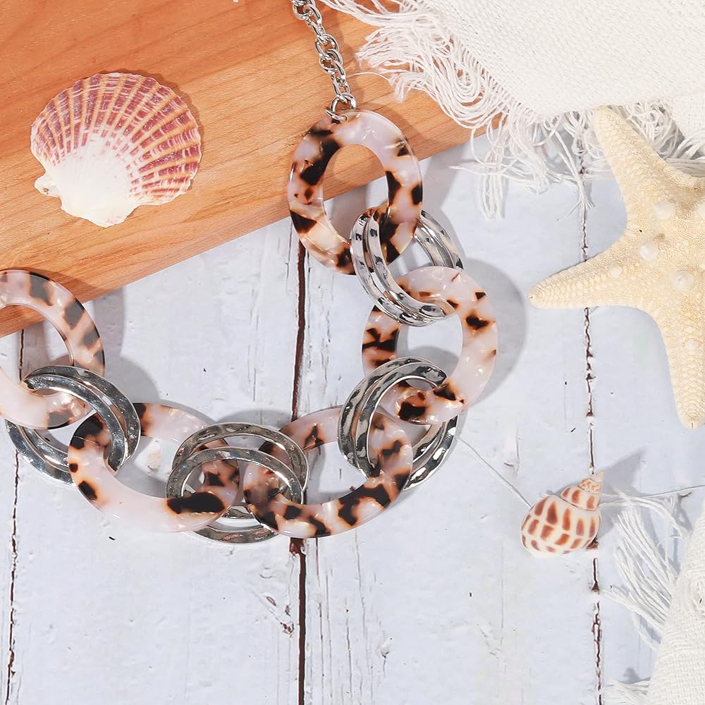 XILAZAB Acrylic Tortoise Link Necklace, Leopard Print Metal Oval Resin Chain Link,Bohemian Acetate Collar Necklace,Chunky Handmade Punk Beige Brown Bib Collar Necklace,Chrismas gifts for womens, Zinc,