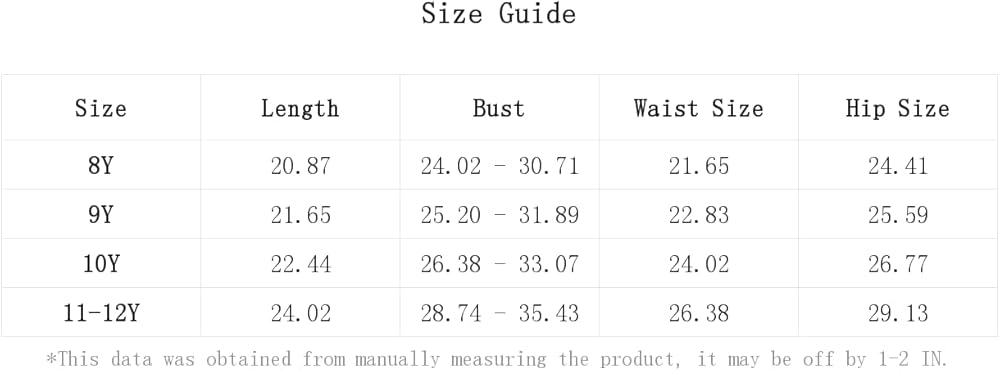 11-12Y:Bust:28.7-35.4IN,Hip Size:29.1IN,Length:24.0IN,Waist Size:26.4IN