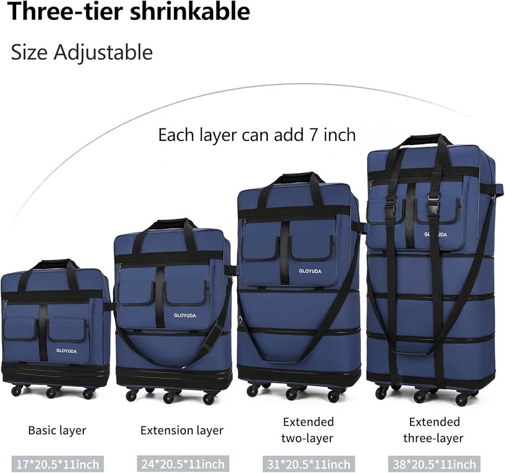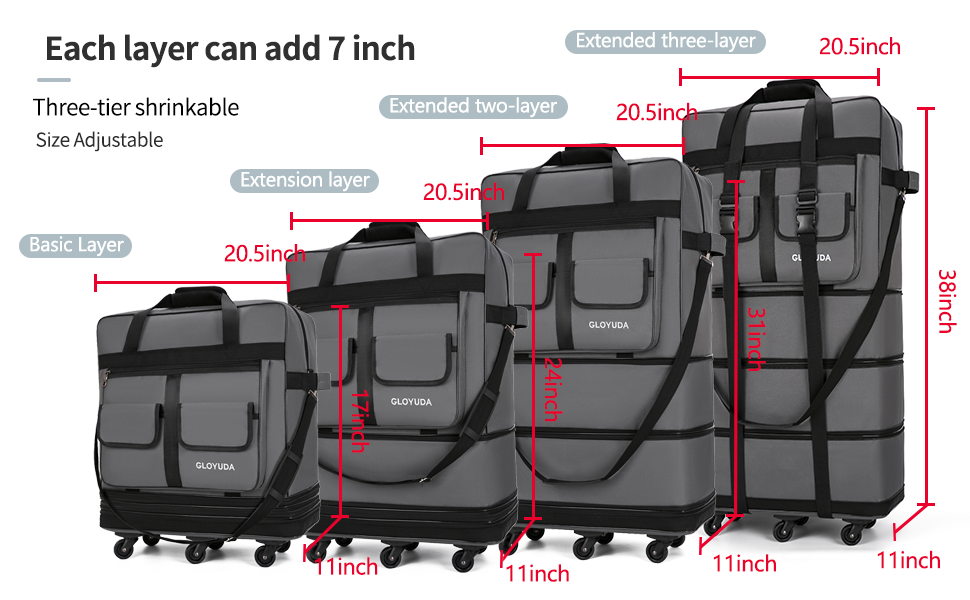 【أبعاد قابلة للتوسيع】توجد خمس طبقات من الحقيبة بعجلة، الحجم الأساسي للحقيبة هو: 17 بوصة (ارتفاع) × 20.5 بوصة (طول) × 11 بوصة (عرض)؛ يضيف كل مستوى 7 بوصات من الارتفاع، جميع السحابات مفتوحة: 96.5 سم (ارتفاع) × 20.5 سم (طول) × 27.94 سم (عرض). يمكن طي الأمتعة إلى حقيبة صغيرة الحجم مقاس 3 بوصات (ارتفاع) × 20.5 بوصة (طول) × 11 بوصة (عرض) سهلة التخزين عند عدم الاستخدام.