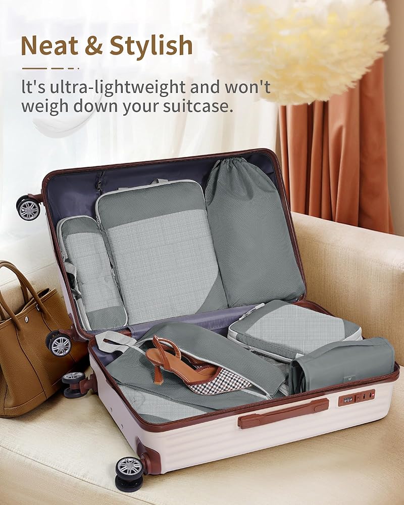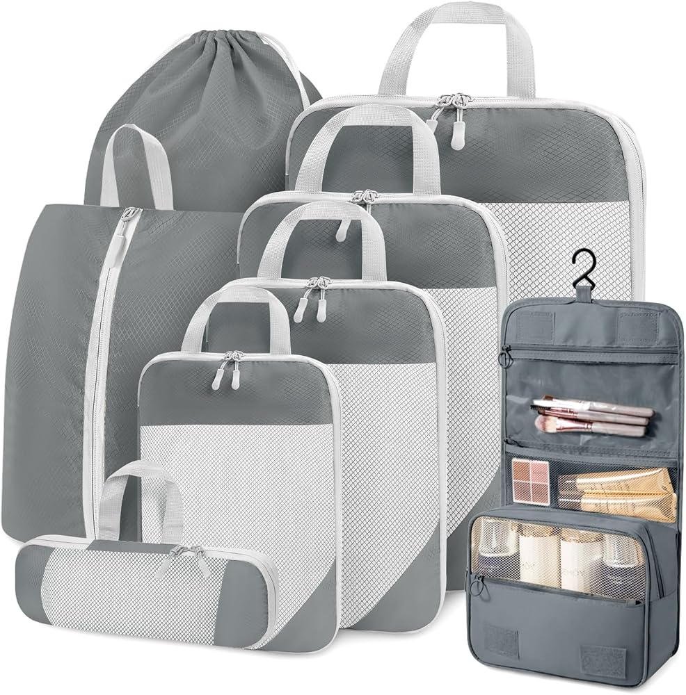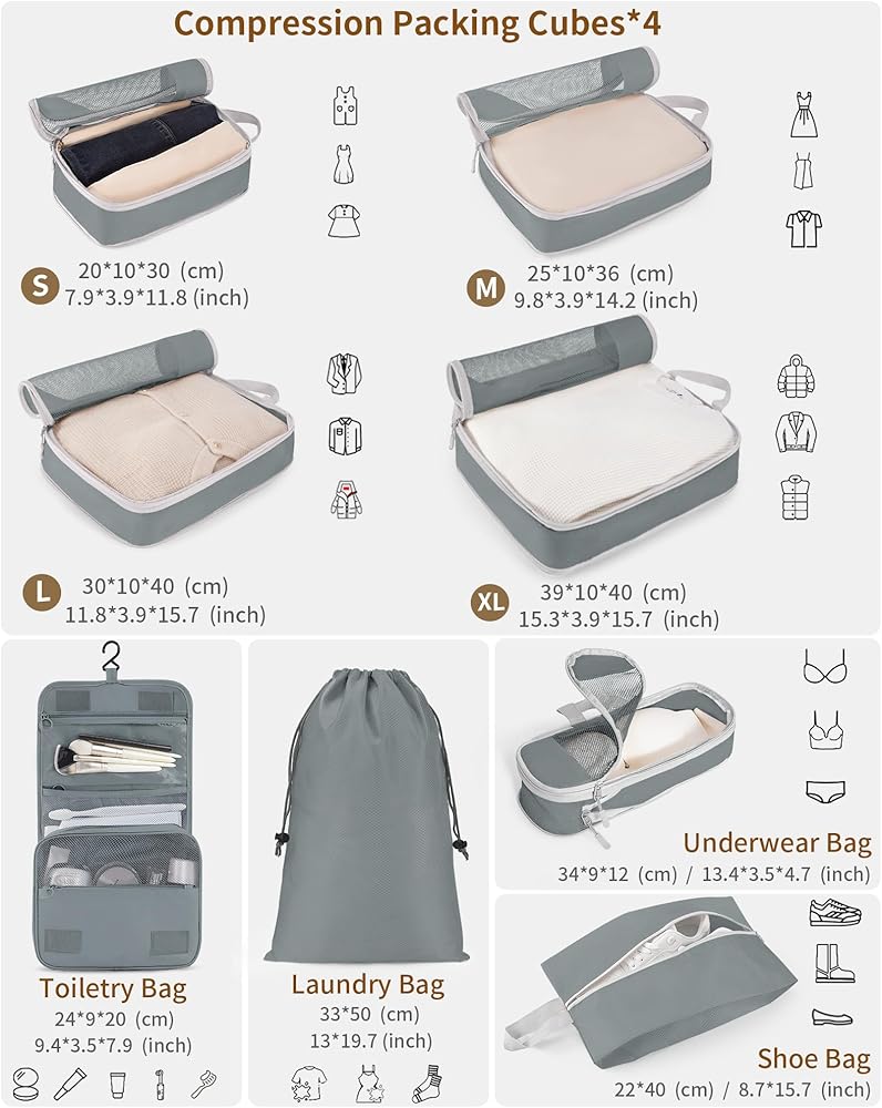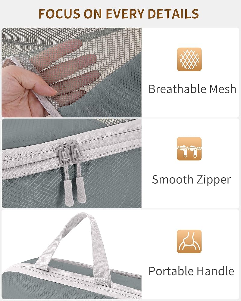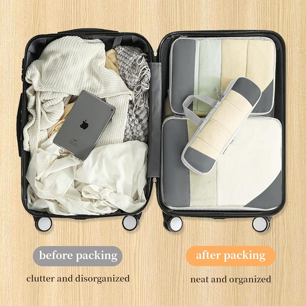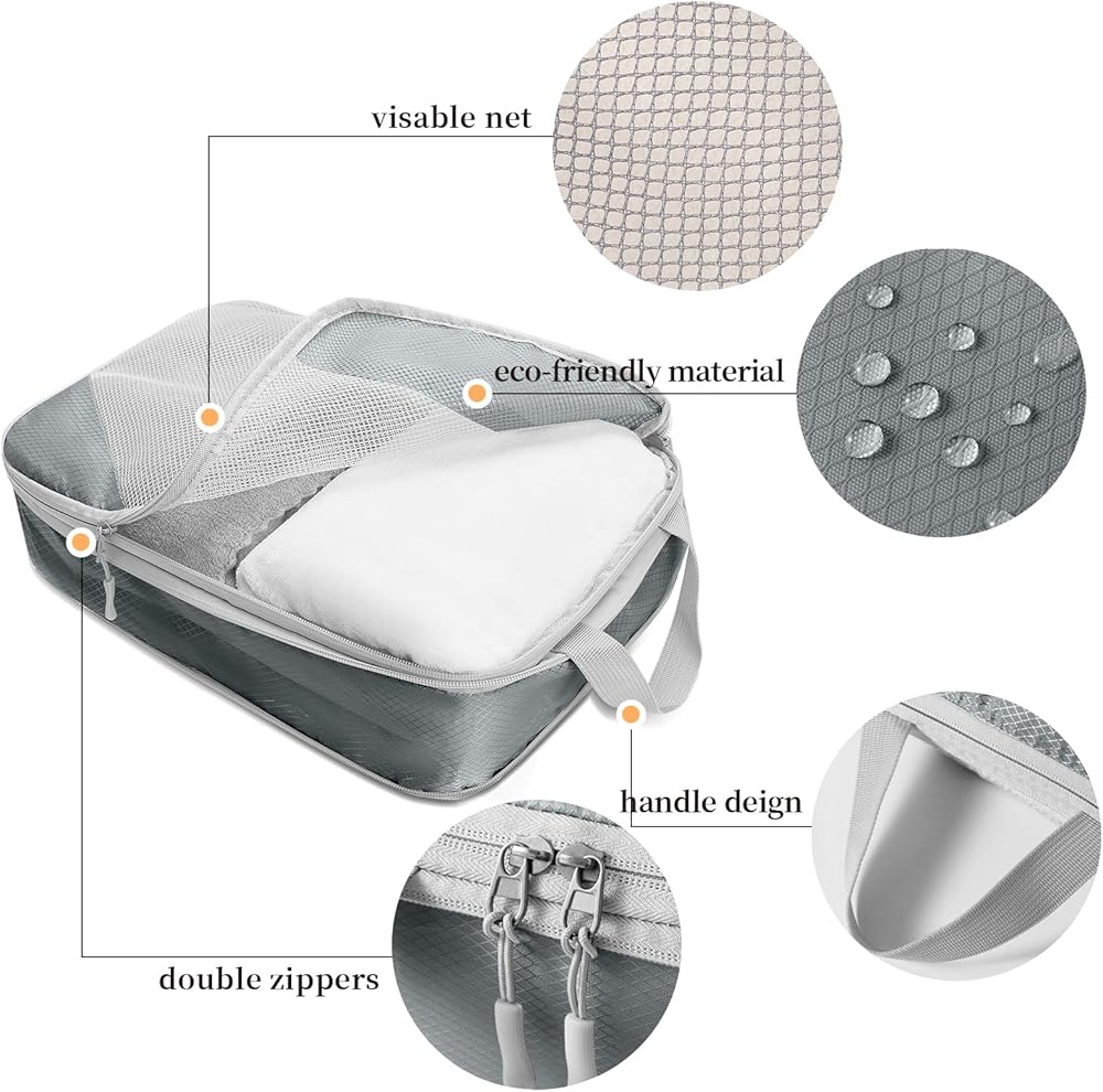 【أقمشة عالية الجودة】حقيبة الضغط المكعبات مصنوعة من نسيج نايلون ناعم، مقاوم للتمزق وطارد للماء، سهل التنظيف وبدون رائحة. والتي يمكن أن تحمي ملابسك من التجاعيد والبقع. ميزة طارد المياه تحمي ملابسك بشكل جيد من الانسكاب أو التسربات.