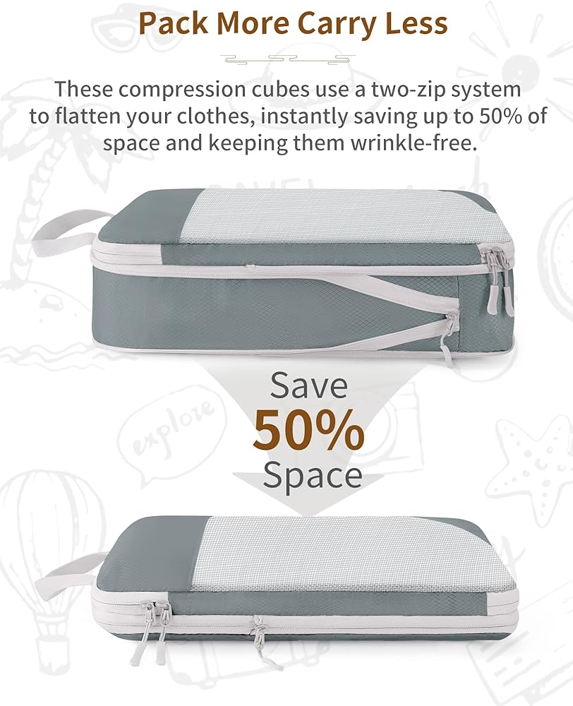 【وفر 60% من المساحة】 على عكس عبوات الضغط التقليدية، أضفنا تصميمًا لإعادة الضغط يمكن أن يوفر ما يصل إلى 60% من المساحة. سحابات مزدوجة، مقبض محمول، فقط قم بتعبئة الملابس المرتبة في مكعبات تعبئة السفر واسحب الجزء الداخلي والخارجي. سحاب مزدوج الطبقة للحصول على مكعبات تعبئة مضغوطة للسفر.