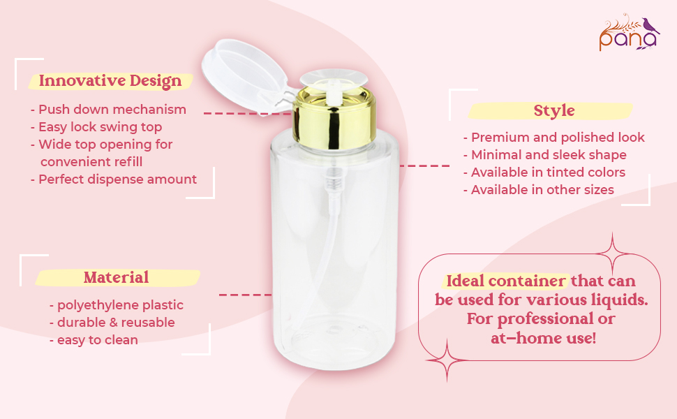 • هذه الزجاجة مناسبة للاستخدام الشخصي والمهني. ضع في اعتبارك أن موزع السائل هذا لا يستخدم للأسيتون