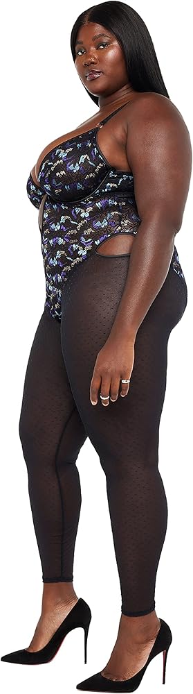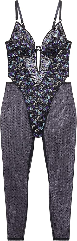 Discover your metamorphosis in our Butterfly Wings Lace & Mesh Catsuit, featuring a lace body with satin trim, point d'esprit mesh legs, a plunge neckline, rose gold-tone hardware, and adjustable straps.
