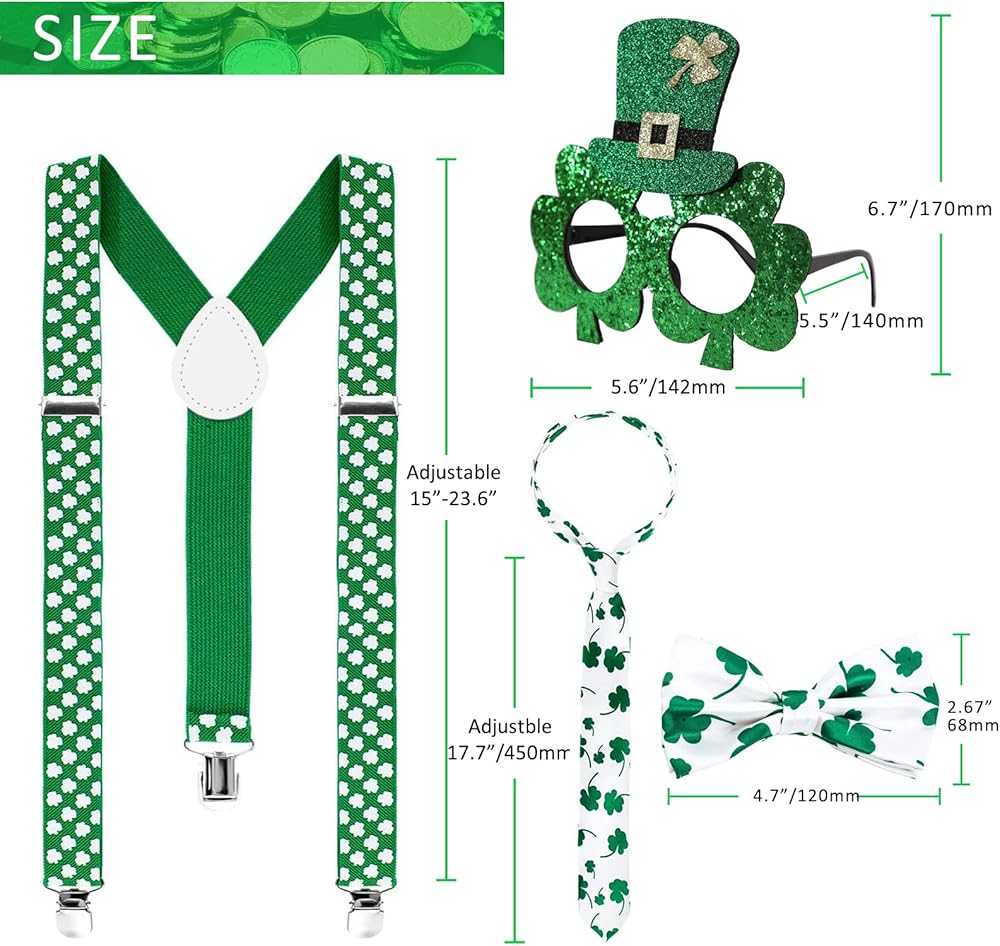 تأتي العبوة مع ربطة عنق وربطة عنق وحمالات وزوج من النظارات، كل ذلك في عناصر شامروك لعيد القديس باتريك