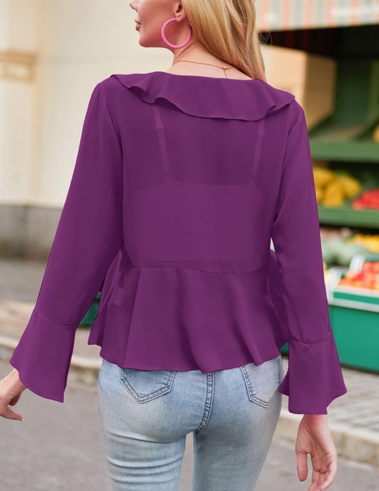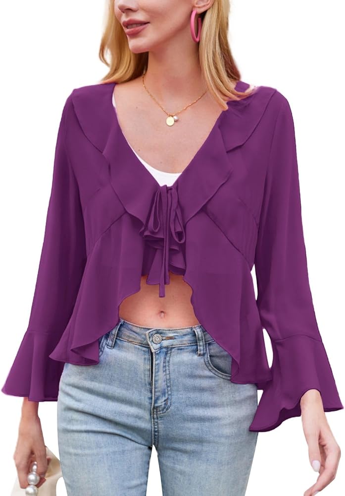 المزايا: سجادات بوليرو أنيقة للفساتين تتميز بنسيج الشيفون، رباط أمامي، رقبة على شكل حرف V، لون ثابت، كم طويل، كم جرس، مقاس كاجوال، شفاف، تصميم مكشكش، أفضل ملاءمة لفساتين الصيف