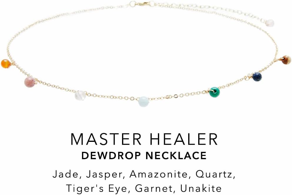 Layer up with our Master Healer 2mm + Dewdrop Necklace Stack! Stimulating all seven chakras and magnified by their proximity to each other, the powerful stones in the Master Healer Necklace bring an all-encompassing feeling of balance and healing to the mind and body. Wear this stack with intention to embrace the earth-born powers and experience benefits such as peace, prosperity, strength, courage, love, and compassion! Featured Stones: Lapis Lazuli, Quartz, Turquoise, Rose Quartz, Rhodolite, Agate, Sandstone, Garnet, Tiger's Eye, Jasper