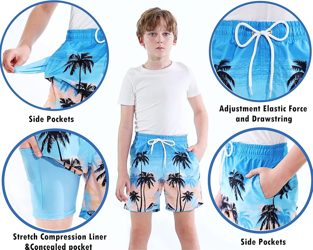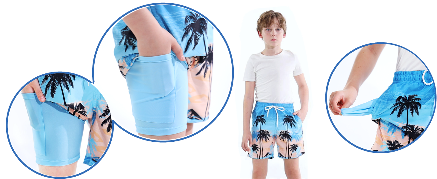• 【3 جيوب】يوجد جيبان في شورت السباحة الخارجي للأولاد وجيب مخفي في البنطلون الداخلي لوضع بعض الأشياء الثمينة.