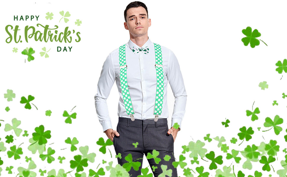 Clover suspenders has a unique and simple design.This set has a lovely green clover motif,white bow tie and necktie to accentuate the clover,which let you be the brightest person in Irish festivals.