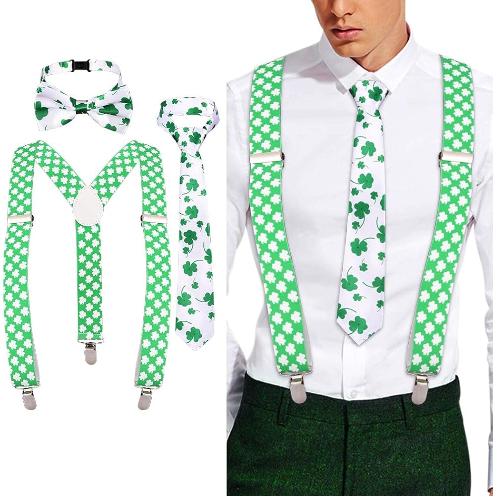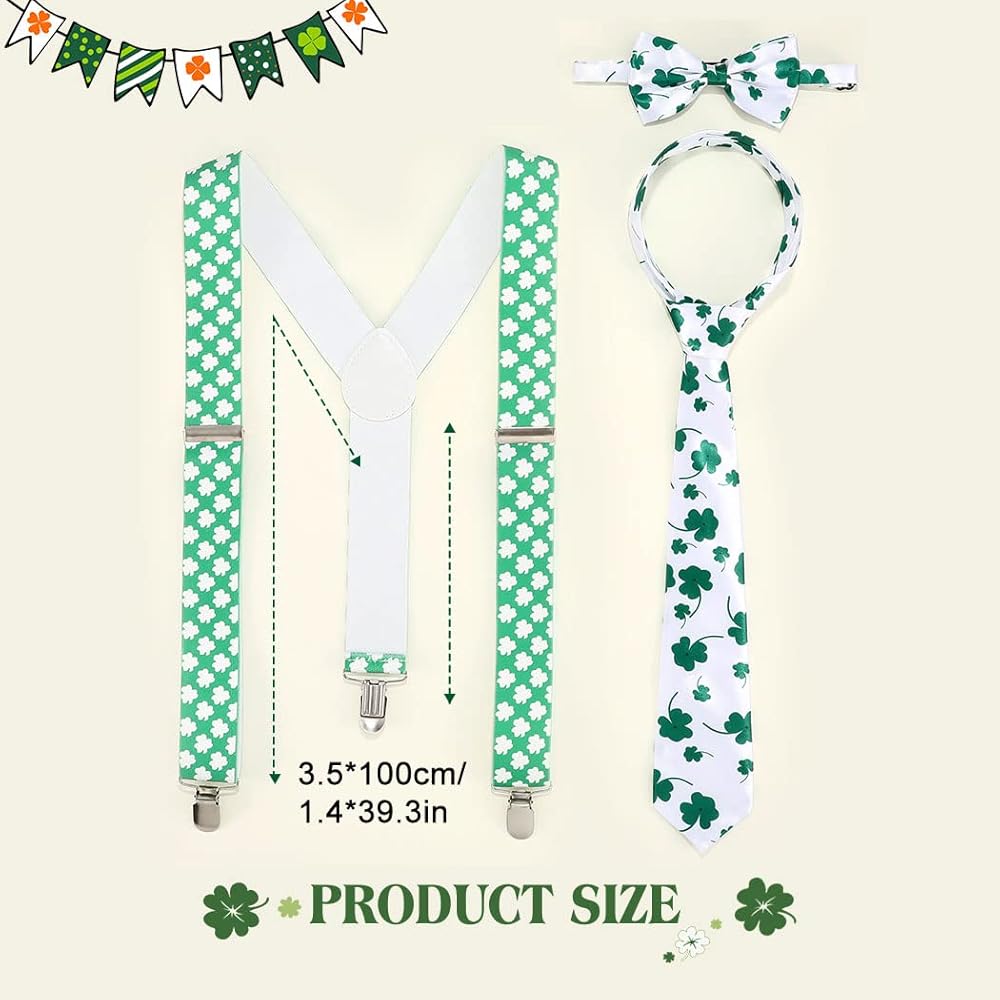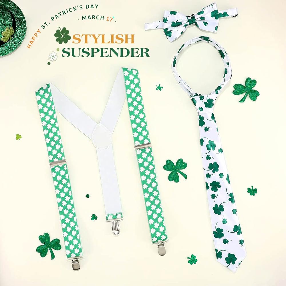 Eyret Shamrock Suspender Set Irish Adjustable Bowtie and Necktie Festival St Patrick Suspenders for Men and Women