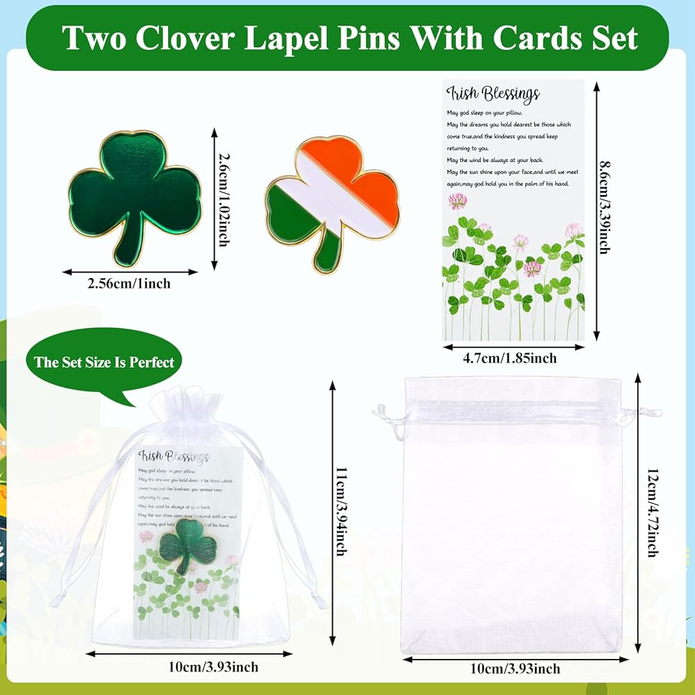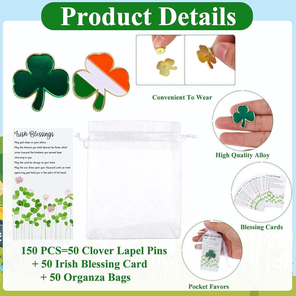 Sufficient Quantity--You will receive a set of 50 pcs St. Patrick's Day gifts,including 50 pcs 3-leaf pins,50 pcs Irish cultural commemorative cards and 50 white organza bags,a total of 150 pieces.Celebrate Irish culture on St.Patrick's Day or every day with our beautiful Irish brooch, a traditional symbol of love,loyalty and friendship.