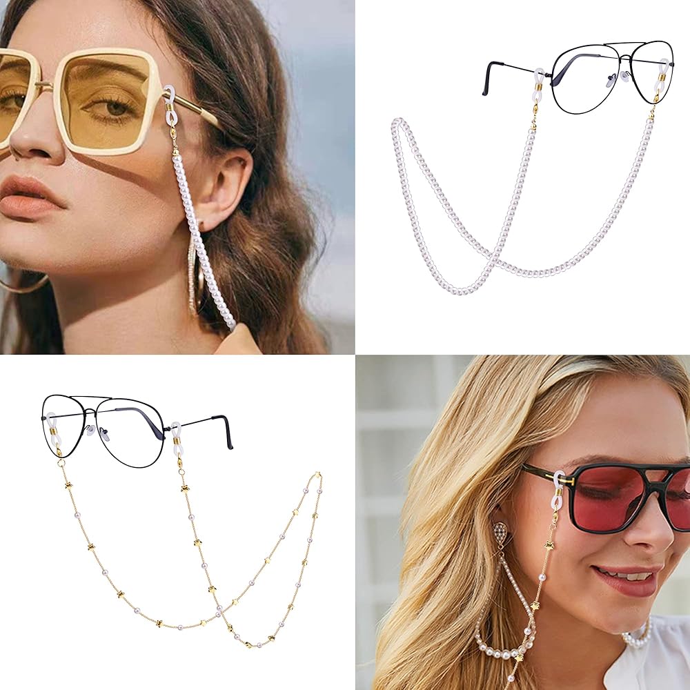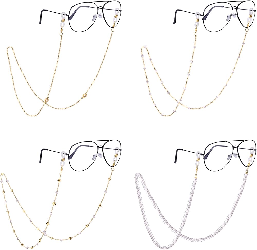 JeryWe 4 قطع سلاسل النظارات مطلية بالذهب عيار 18 قيراط للنساء مجموعة سلاسل النظارات اللؤلؤية