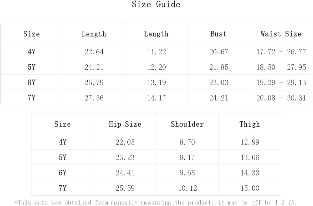 7Y:Hip Size:25.6IN,Length:27.4IN,Thigh:15.0IN,Waist Size:20.1-30.3IN,Bust:24.2IN,Length:14.2IN,Shoulder:10.1IN