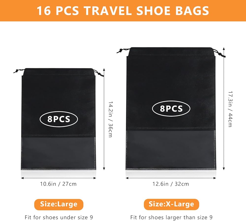 • 【2 Different Sizes Shoe Bags】 Package includes 16 pcs travel shoe bags, 8 pcs standard sizes: 10.63" x 14.17"/ 27 x 36 cm, fit for shoes under size 9; 8 pcs X-Large sizes: 12.6" x 17.32"/ 32 x 44 cm, Large enough for men shoes between Size 10 to Size 13, also can store 2 pairs of kid shoes. Different size designs can meet the storage of different shoe types, which is convenient for your travel to easily carry multiple pairs of shoes.