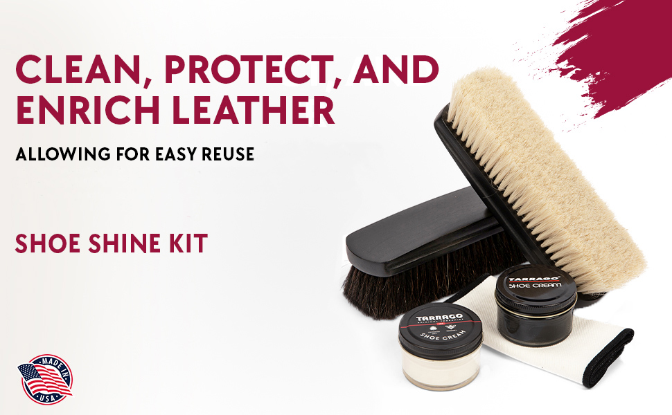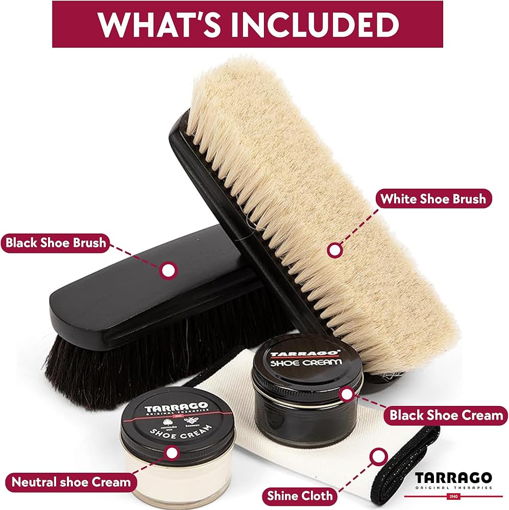 • COMPREHENSIVE SHOE CARE: Elevate your shoe care routine with the Tarrago Shoe Shine Kit, featuring Shoe Cream in Black and Neutral, a Large Horsehair Brush in Black and White, and a high-quality Shine Cloth.