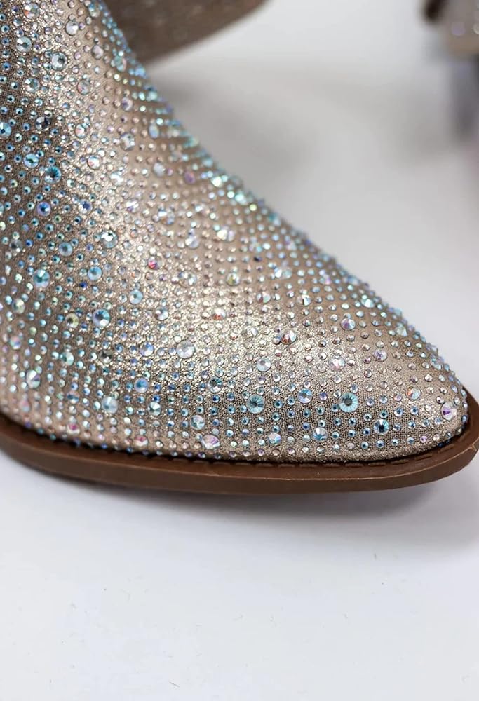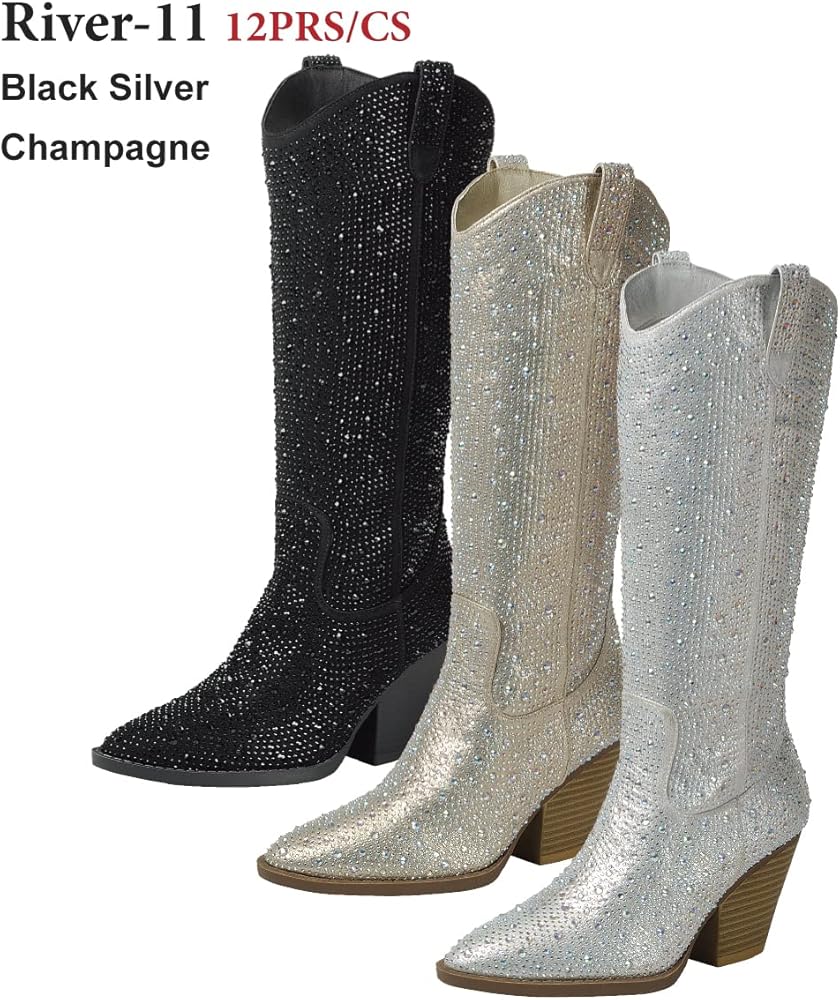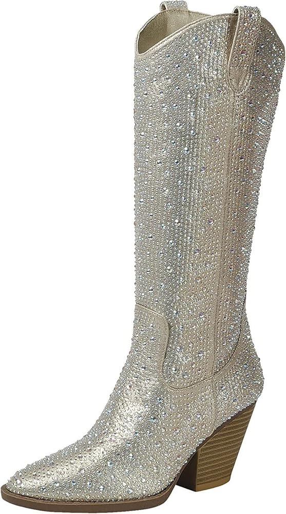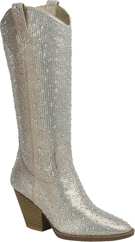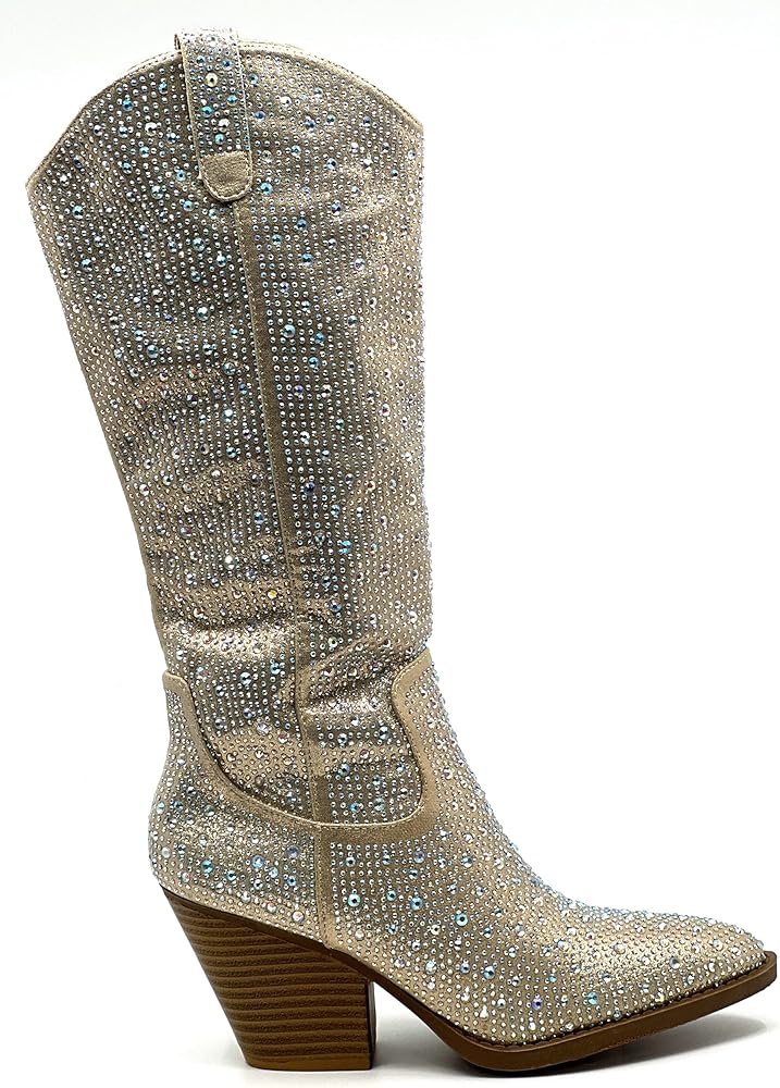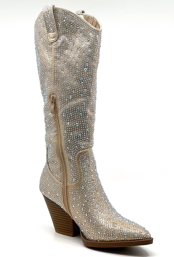 Block heeled Mid Calf Knee High boot, Slip on Style , All over Rhinestone embellishments