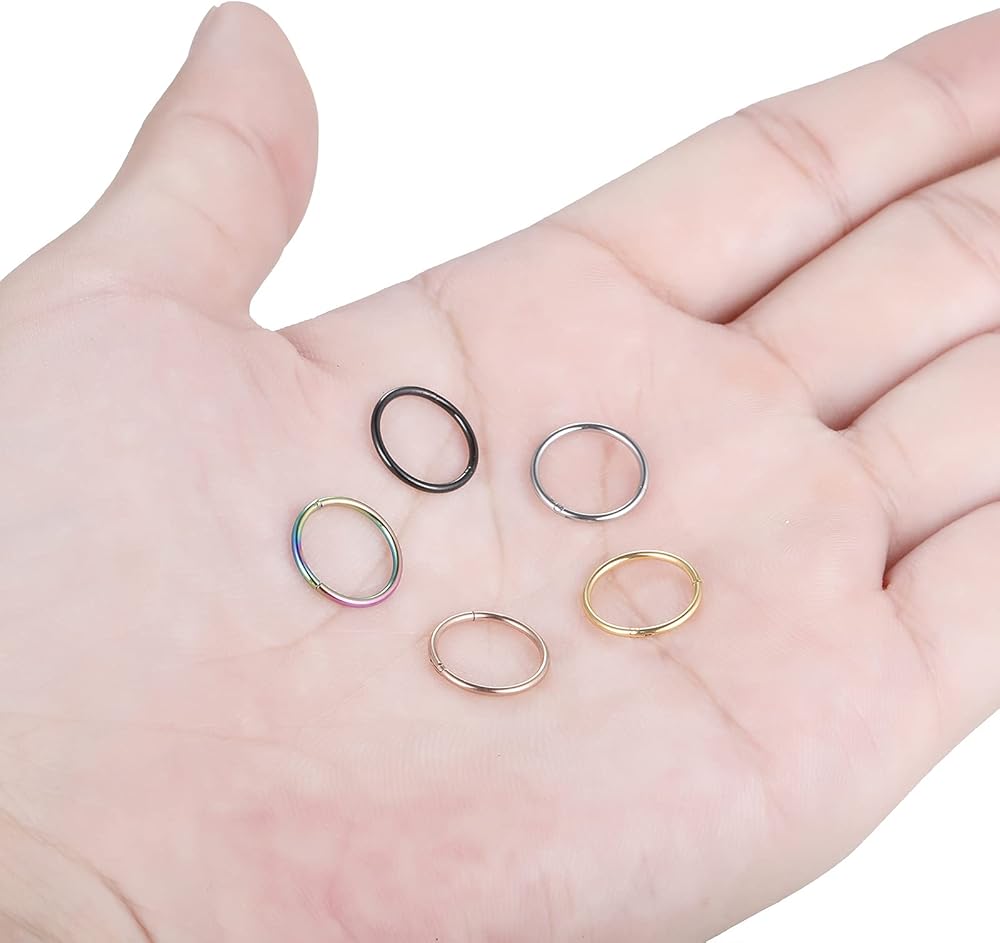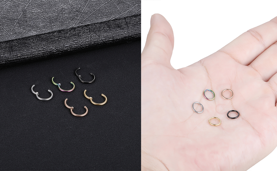 Package: 5 pcs small nose ring hoop/earring hoop, 5 different colors but same ring size in one set.Can be used as nose piercing, septum ring, lip ring, cartilage hoop earring,helix earrings,conch hoop earring,daith piercing jewelry