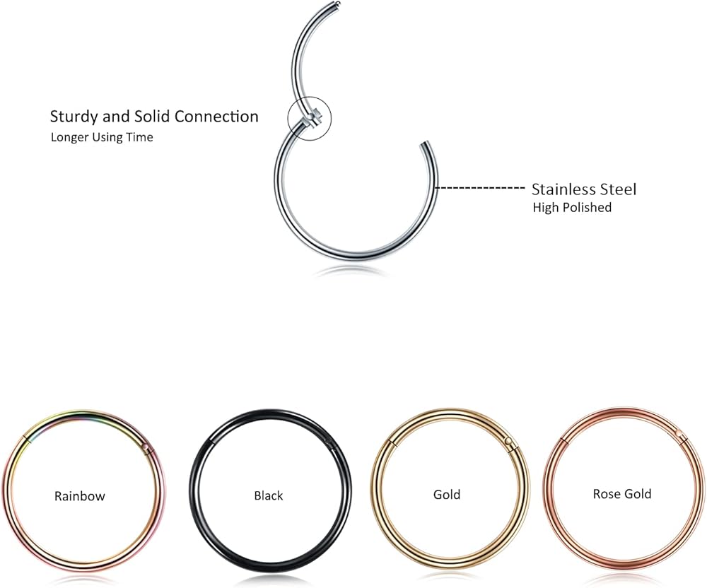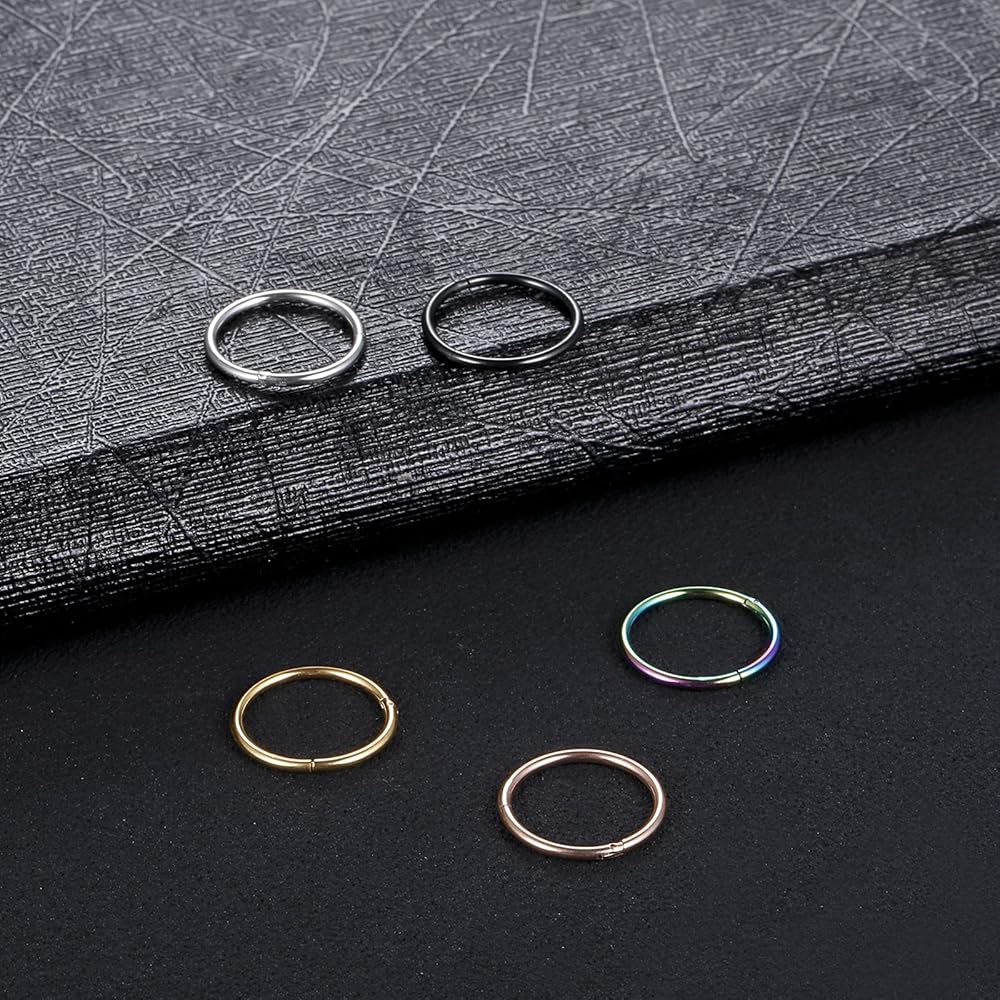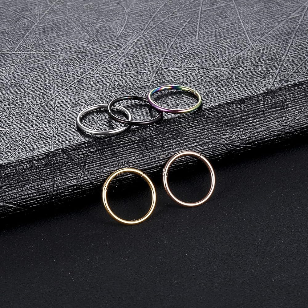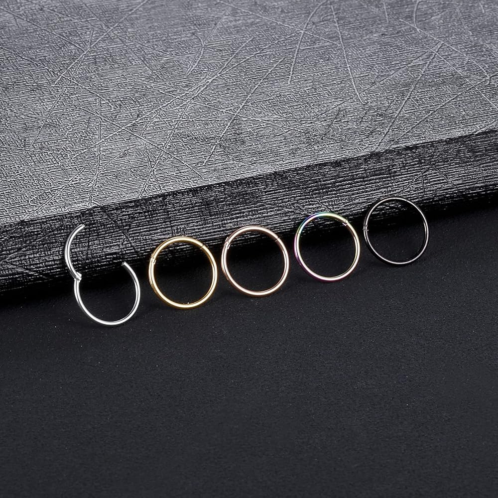 Oveta 5pcs Hoop Nose Ring 14G 16G 18G Surgical Steel Nose Ring Hinged Segment Ring Septum Ring Cartilage Daith Conch Earrings Hoop Piercing Jewelry, Gold Black Silver Rosegold Rainbow Colors