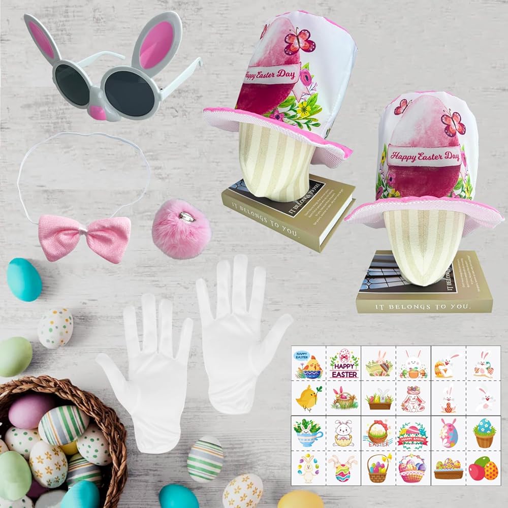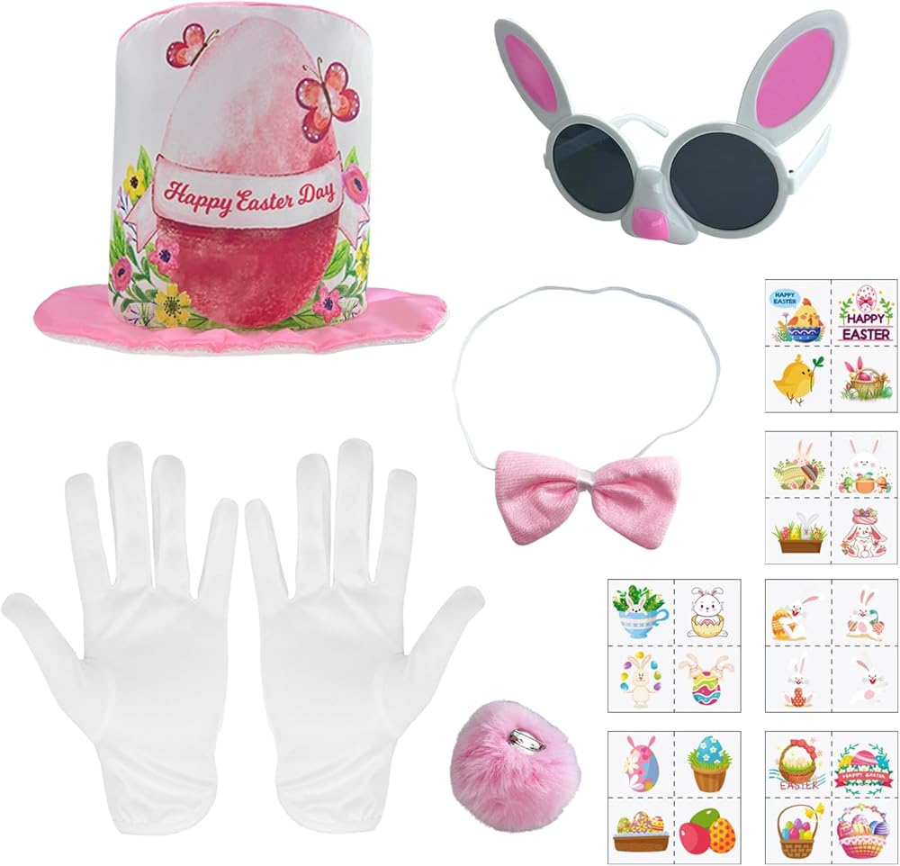 Easter Costume Set: The women's Easter costume accessories include 1 Easter egg hat, 1 pink bow tie, 6 Easter tattoo stickers, 1 pair of white gloves, and 1 pink rabbit tail, meeting your needs for the costume party.