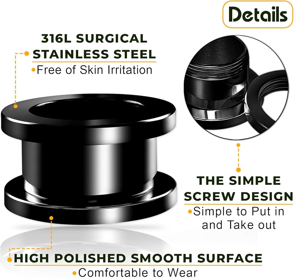 يتم استخدام الفولاذ الجراحي عالي الجودة في نفق الأذن باللون الأسود 00 جرام؛ إنها درجة زراعة ومتوافقة بيولوجيًا مما يعني أنها لن تسبب التهيج. الفولاذ الجراحي مقاوم للتآكل وسهل التنظيف.