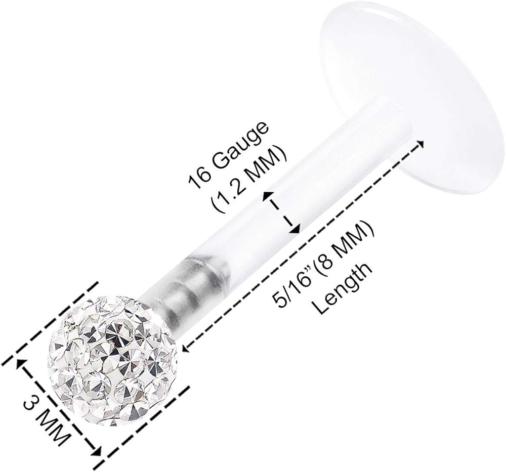 ستحصل على قطعتين بوزن 16 غرام (1.2 ملم) 5/16 انش (8 ملم) دبوس ضغط اكريليك شفاف مرن حيوي مع كرة كريستال شفافة من الستيل 316L 3 ملم مع غطاء من الراتنج. يتم تخزينها بأمان في حقيبة من الساتان أو صندوق مجوهرات.