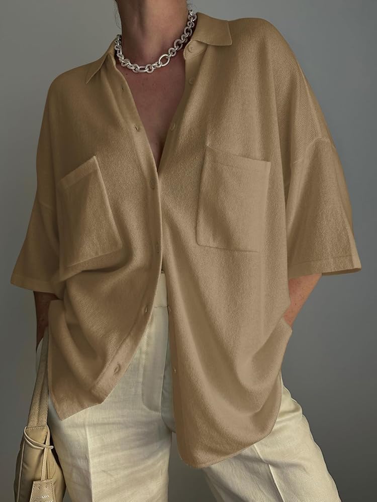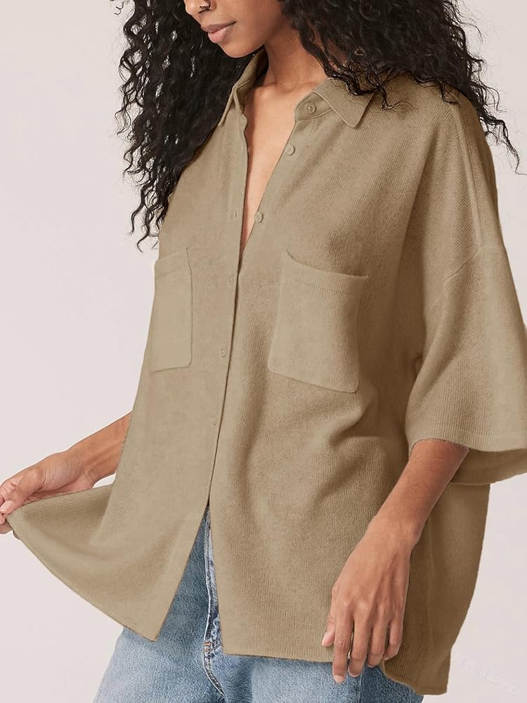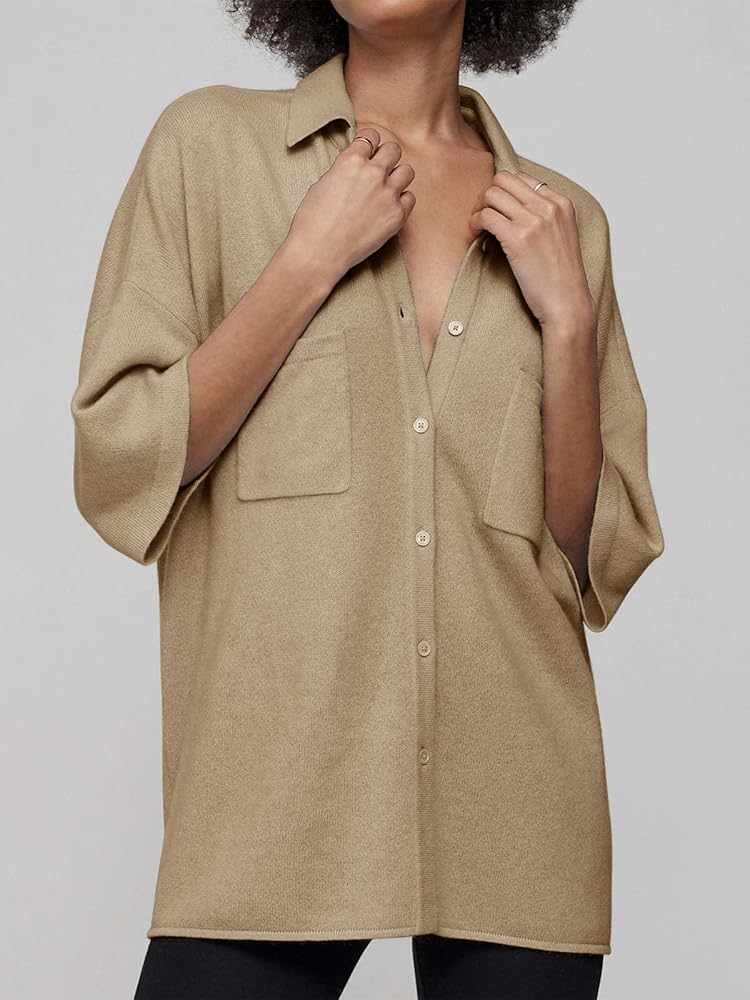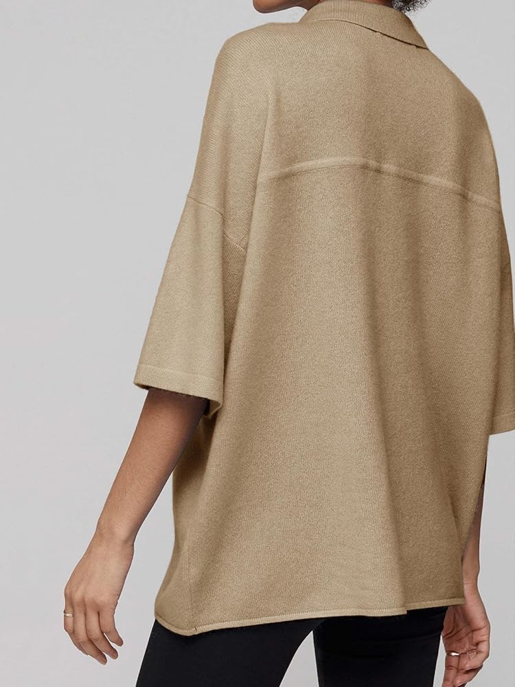 المادة: أكريليك 53%، بوليستر 32%، نايلون 15%. قمصاننا النسائية قصيرة الأكمام مصنوعة من قماش فاخر، مريحة وناعمة الملمس.