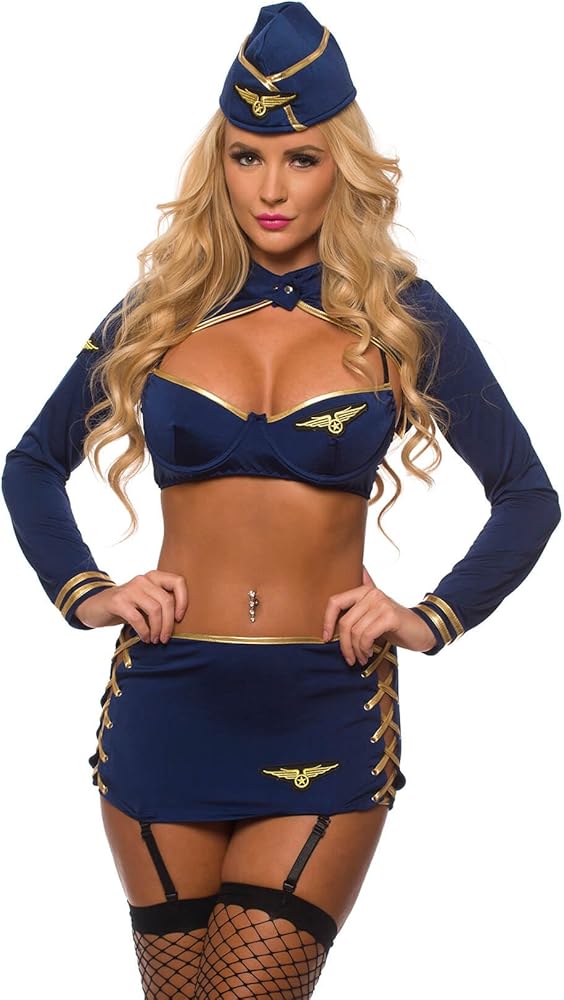 You're sure to join the mile high club in this Cockpit Cutie Costume. This enticing costume features a molded underwire cup bra with adjustable shoulder straps, snap closure long sleeve bolero, and garter skirt with side lace up detail with adjustable and removable garter straps. This set also includes a matching g-string, foam hat and fishnet thigh high stockings.