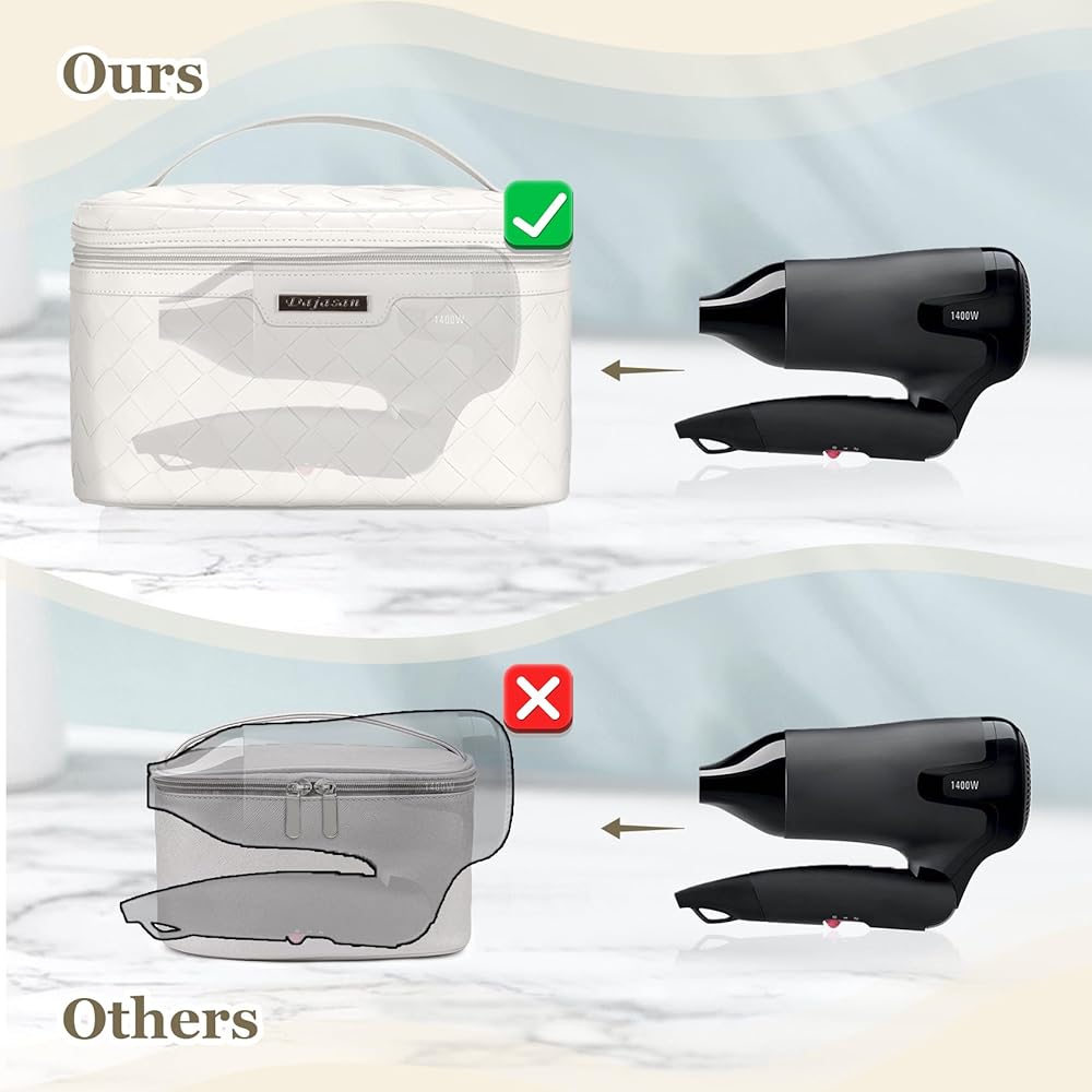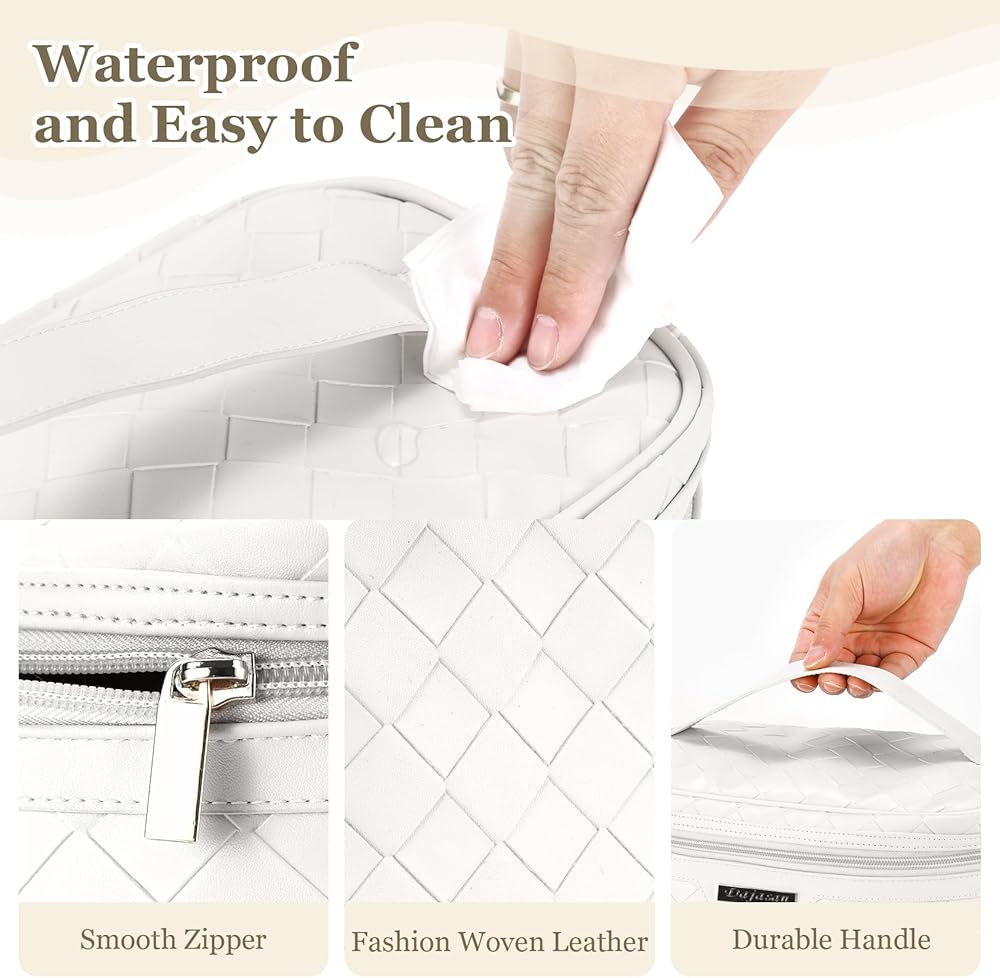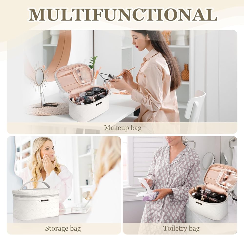 • 【Fashional and Durable】: This large makeup bag is made of high-quality PU leather and has excellent durability, water resistance, allowing you to use it for a long time. The surface design of the make up bag is a diagonal woven pattern and is equipped with a smooth metal zipper. Exquisite and stylish yet practical.