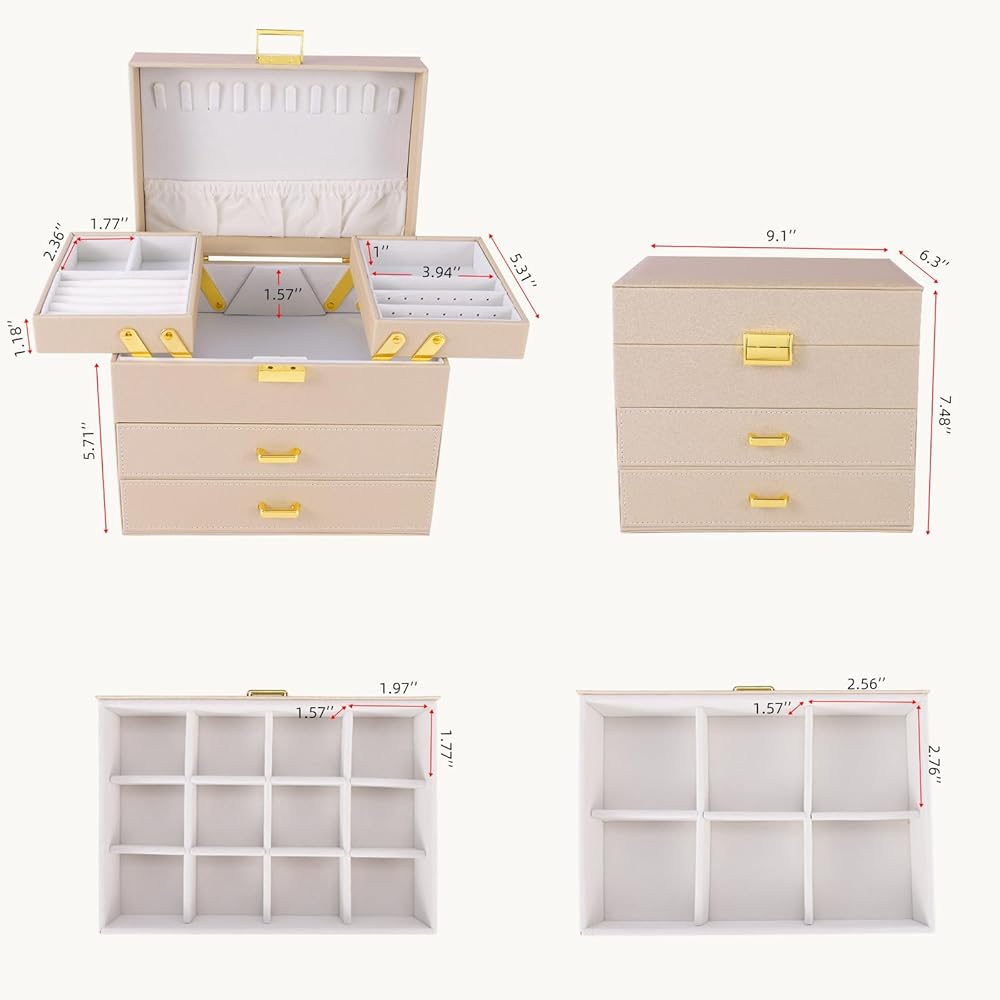 صندوق مجوهرات كبير من Dajasan مكون من 4 طبقات + حقيبة مكياج ذات سعة كبيرة