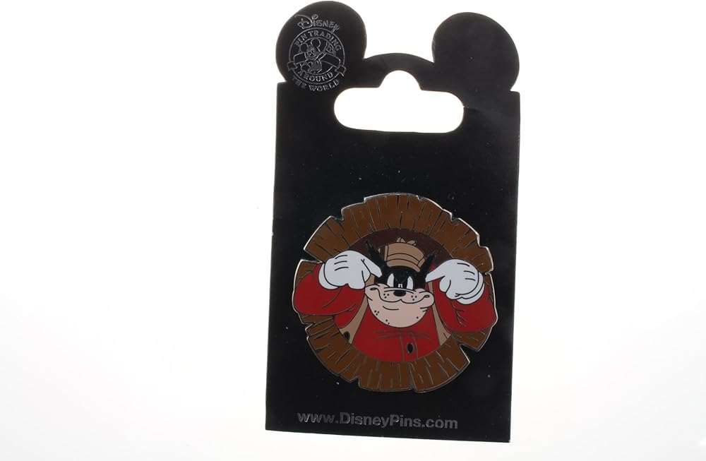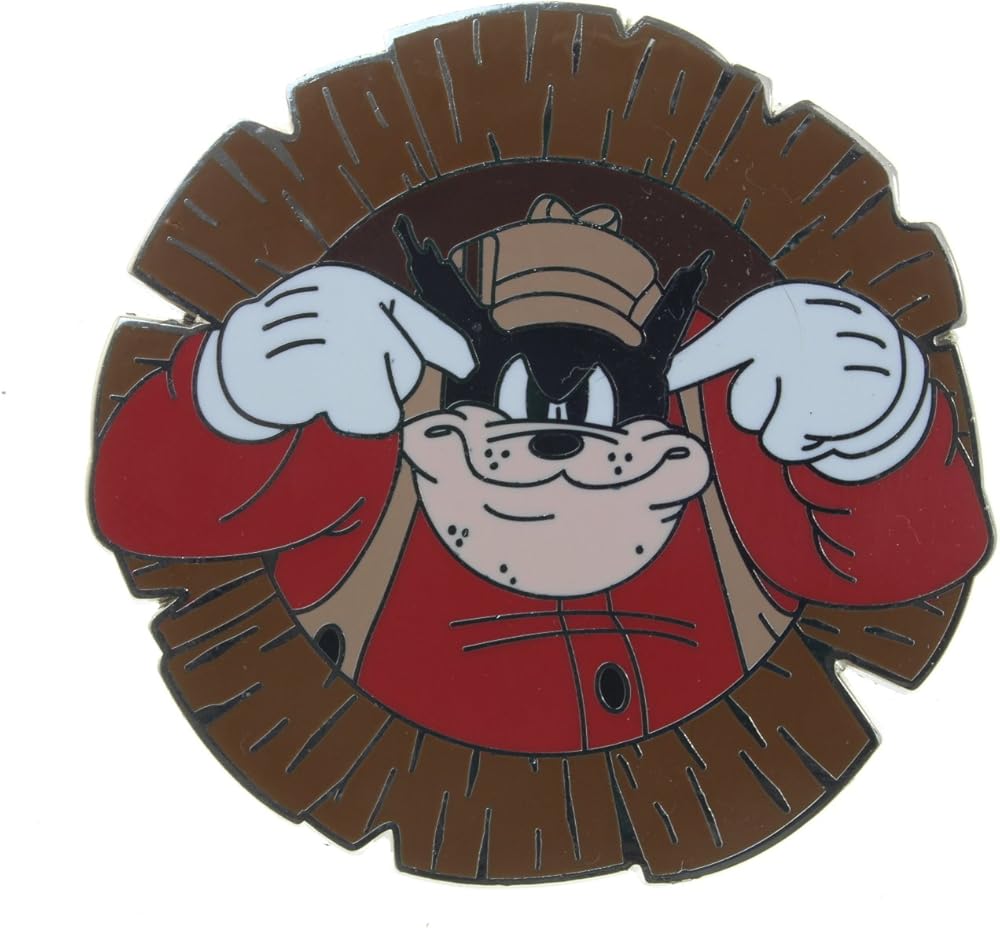 Open Edition Villain pin, Peg Leg Pete. Round shaped pin with Pete in the center, wearing a red shirt and brown hat. He has his fingers in his ears like he is waiting for something to explode. He is within a brown wood-like frame.